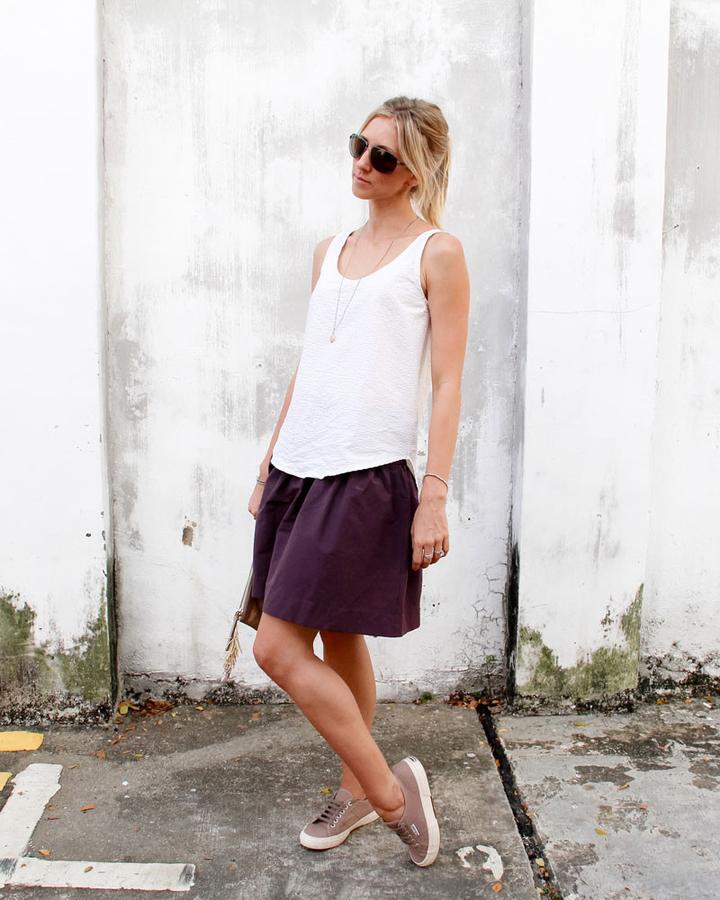 The dark purple Basics Drop Skirt pictured was created with Bengaline Suiting with slight stretch and 100% recovery. The grey Drop Skirt was created with a light weight linen.