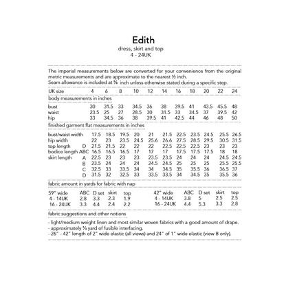 Edith is an exciting pattern, offering the opportunity to use your imagination to create many new additions to your wardrobe. Although there is a wide range of options within the pattern, all of its elements should be within a keen beginner’s grasp. Edith features an elasticated waist for comfort, three neckline options, two skirt lengths, straight or curved hem, four different sleeves, as well as a skirt and top option.