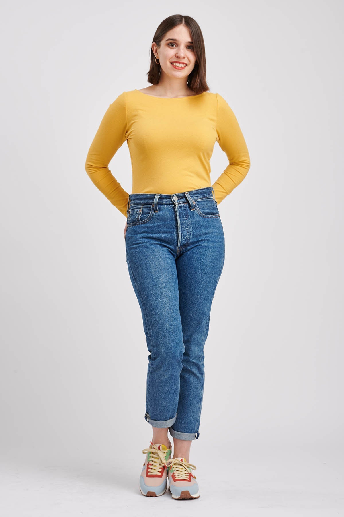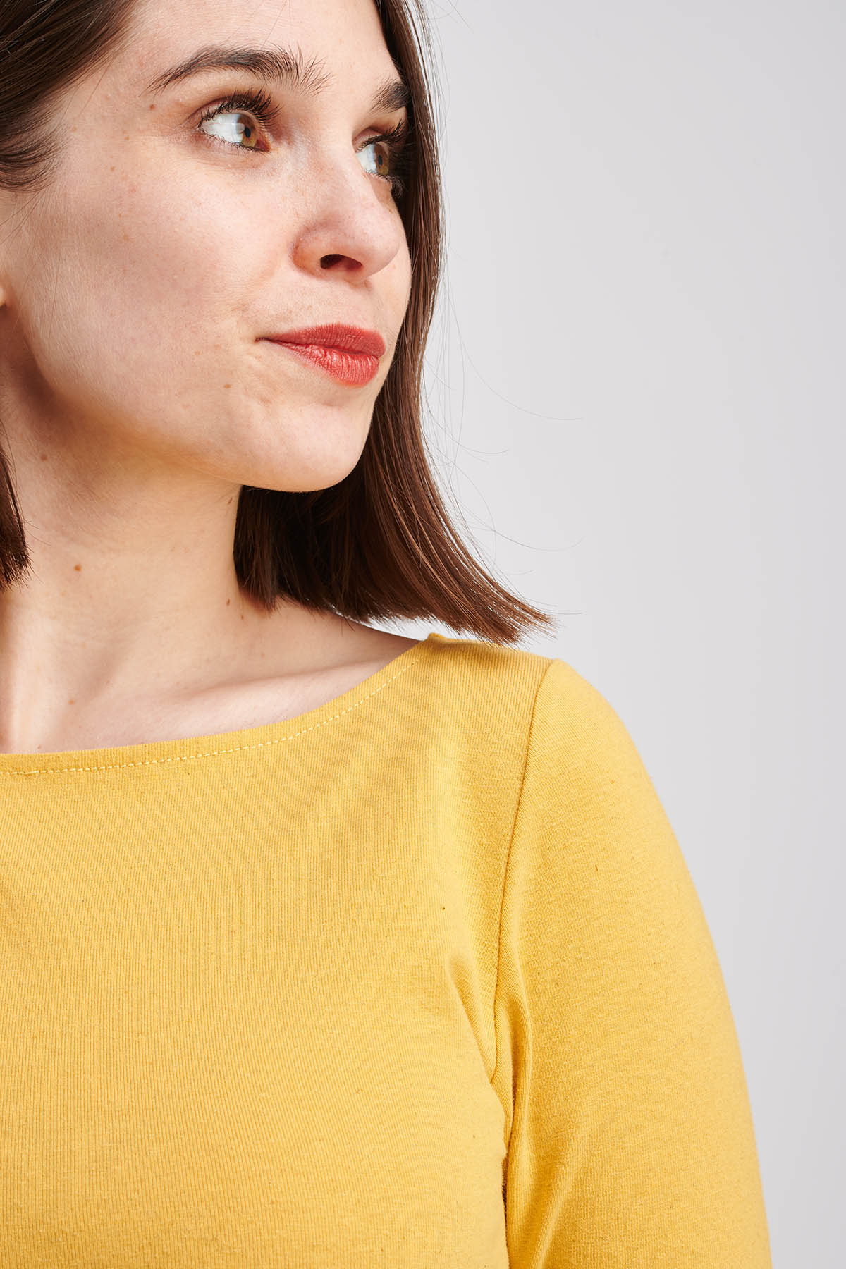 The yellow t-shirt was sewn in an jersey from Ma Petite Mercerie.