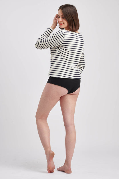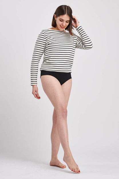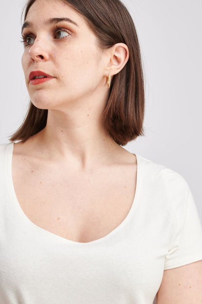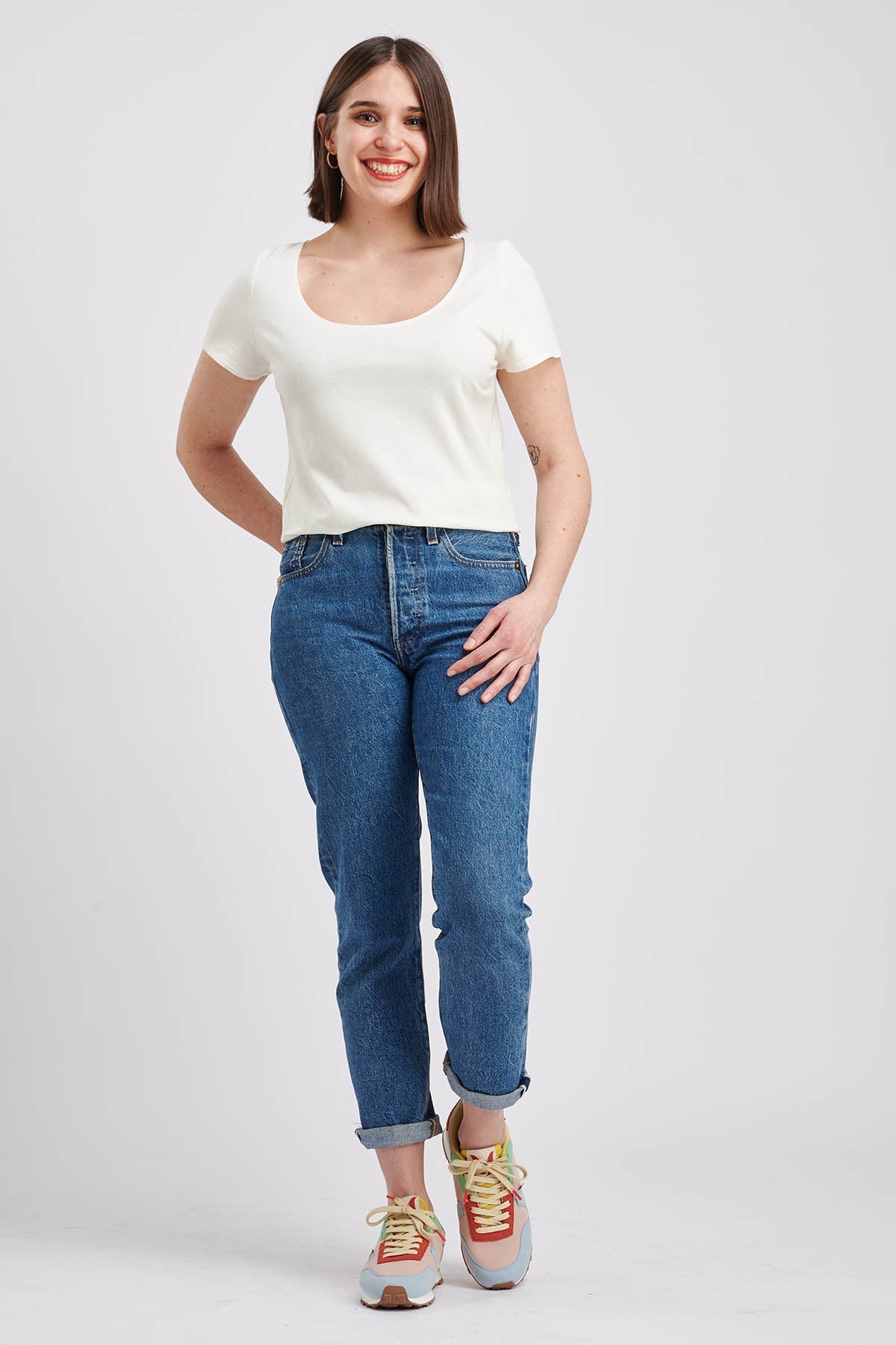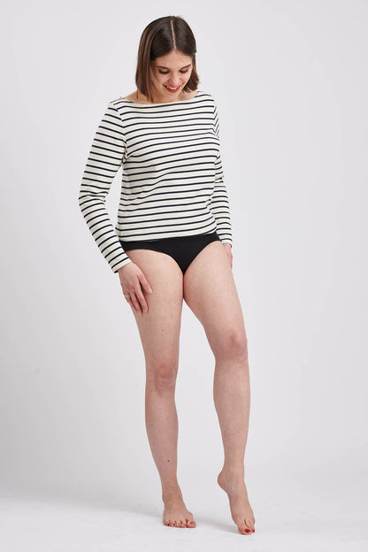 I am Chantal, a timeless bodysuit and t-shirt with 24 versions to choose from. Available in a relaxed or a fitted cut, I have 3 sleeve options: short, 3/4 or long and 2 neckline options: boat neckline and scoop neckline. The bodysuit versions consist of a t-shirt bodice and a shorty style panty that closes with 3 snap fasteners at the crotch. Choose your favourite version and together let’s conquer your future!