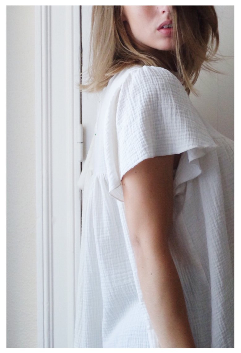 intermediate : versions without collar and with long sleeves which are more technical with the mini ruffle at armhole and the assembly of cuff and slit.