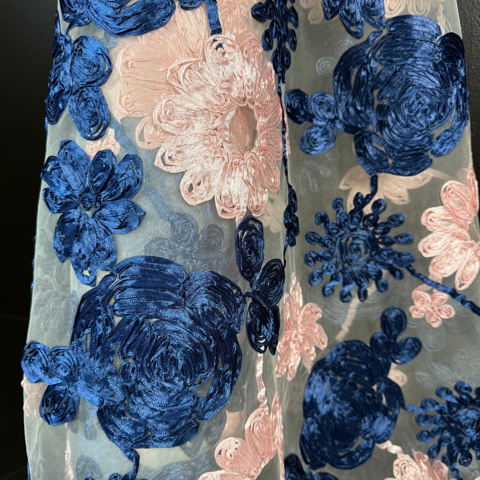 A breathtaking embroidered sheer lace featuring sculpted florals in deep navy and soft blush Each petal is formed from lustrous thread loops, giving dimension and drama while keeping the fabric gracefully sheer.