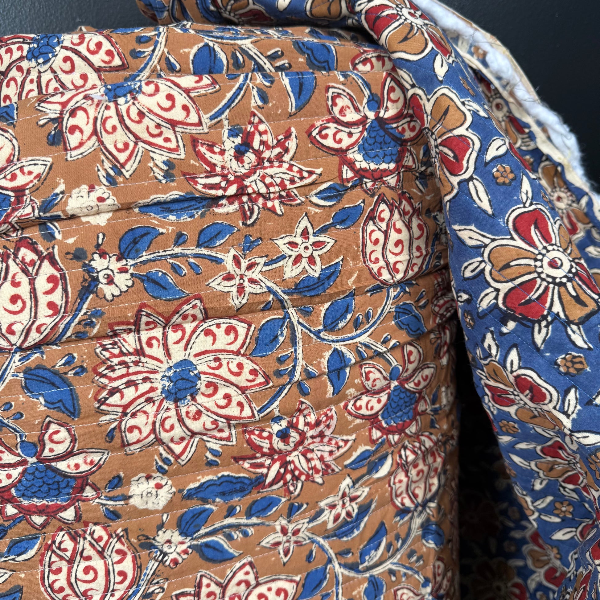 Petals Parchment/Indigo + Vintage Garden Mocha - Quilted Bagru Indian Cotton Block Print (Reversible)