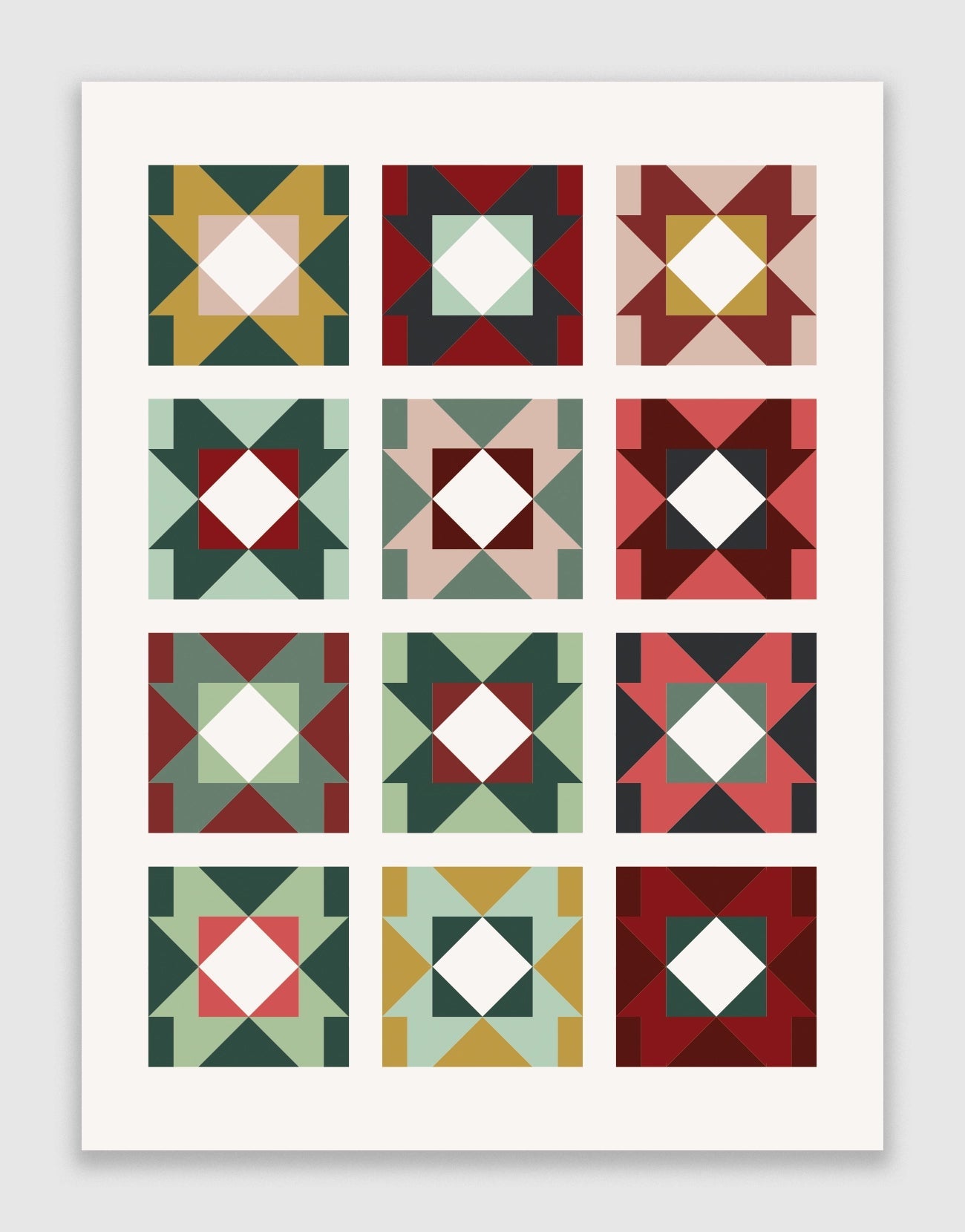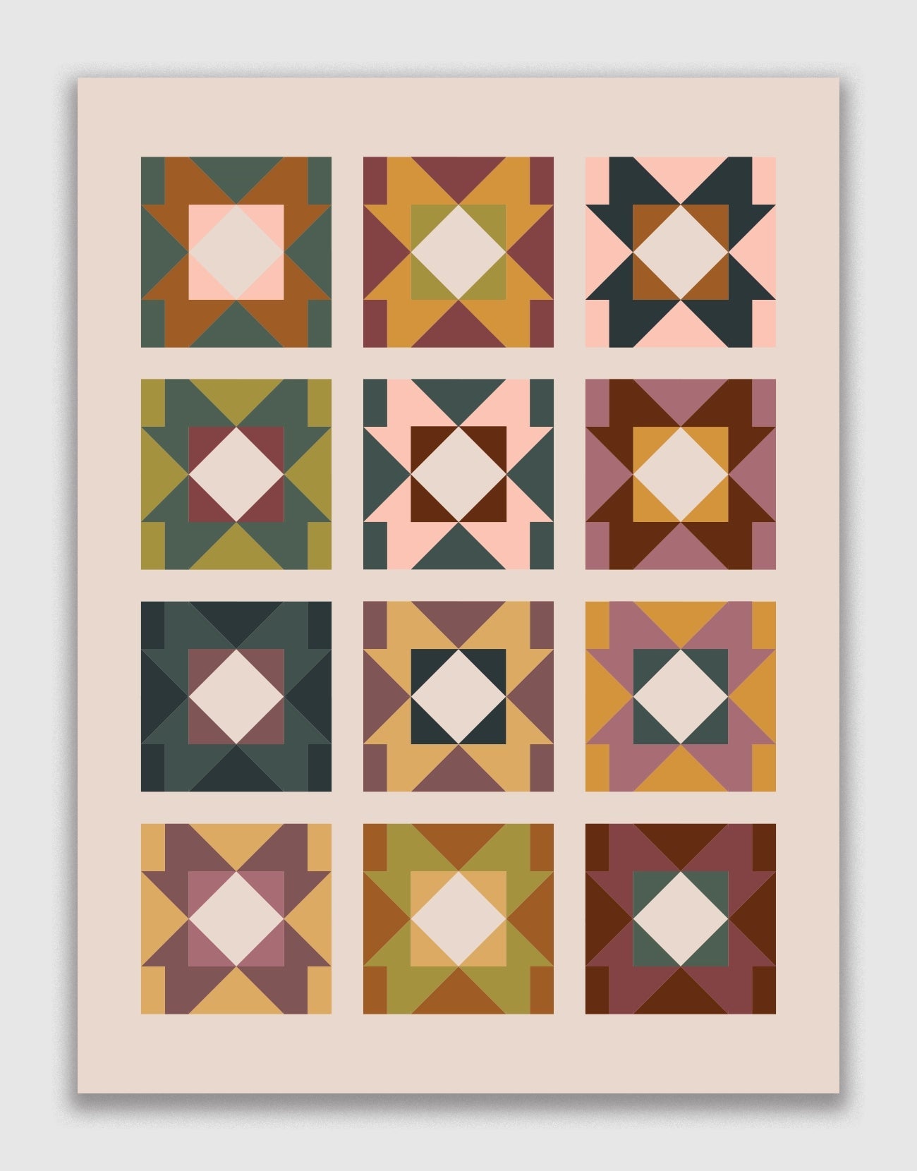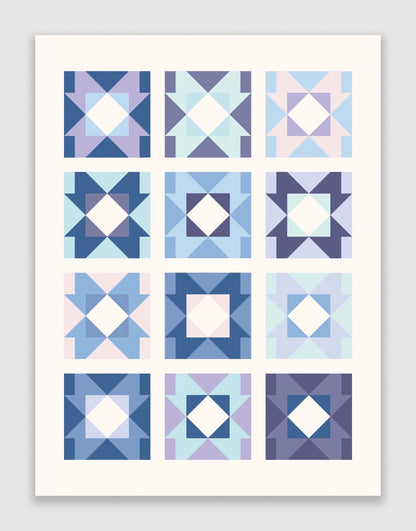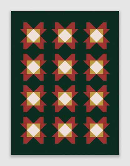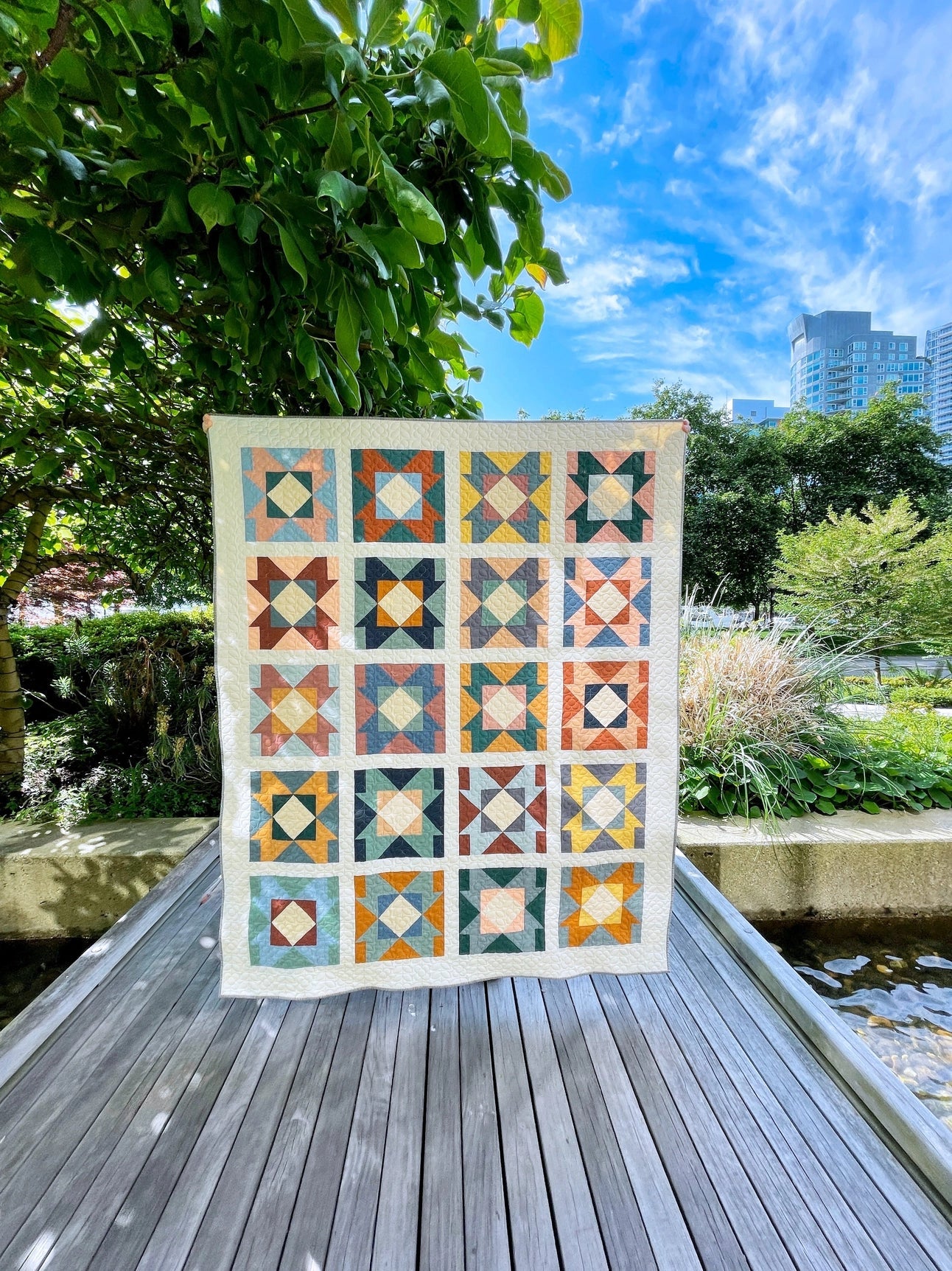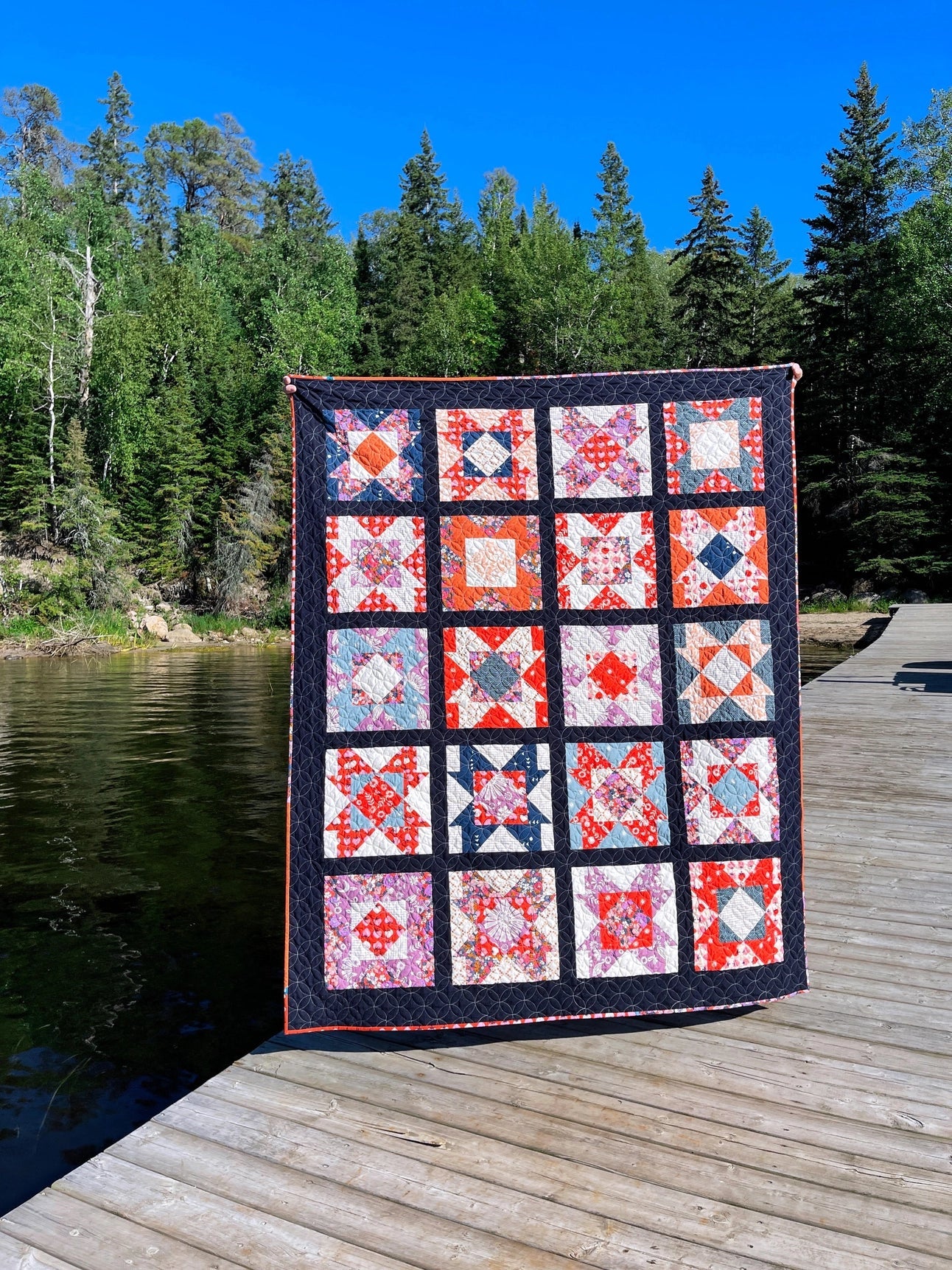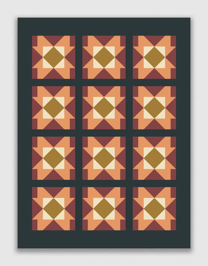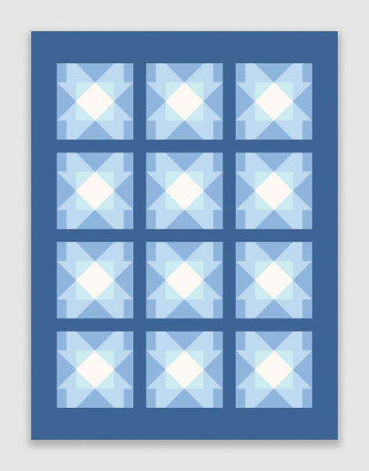 This modern, original quilt pattern utilizes a 12" block design and is appropriate for confident beginners! Includes a five-colour, two-colour and FQ-friendly option. The pattern includes instructions for the following sizes: