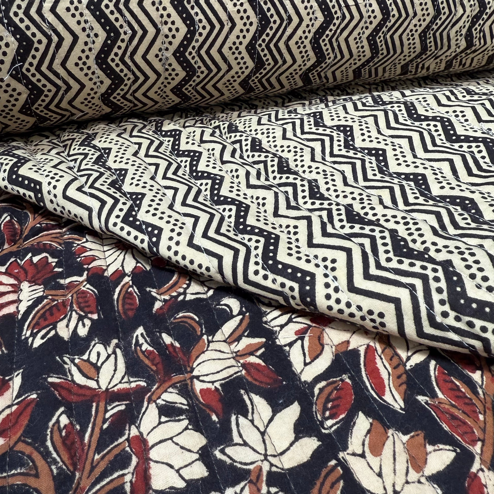 Bring timeless tradition to your sewing projects with our Quilted Bagru Indian Cotton Block Print Fabric. Handcrafted in Rajasthan, India, this fabric combines the beauty of centuries-old block printing with the cozy texture of pre-quilted cotton.