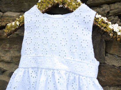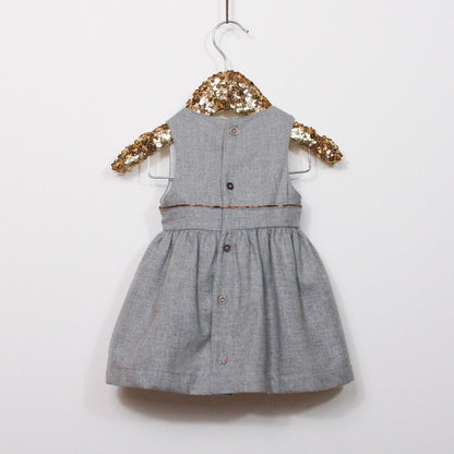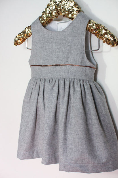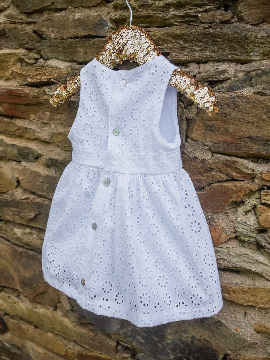 Sewing pattern for Baby Girl Sleeveless dress. Full lining. Buttoned-down back opening. High waistband. Gathers at skirt. Knee length.