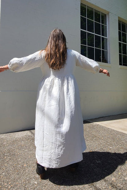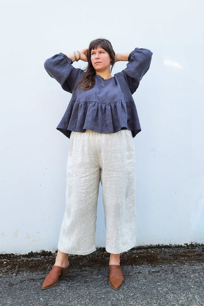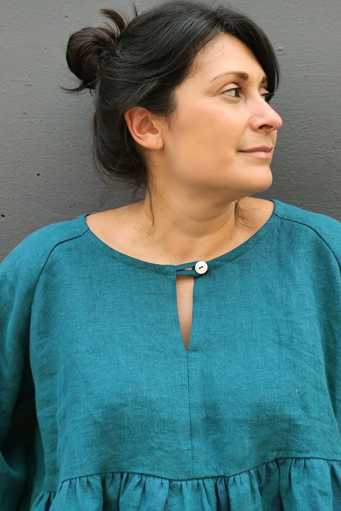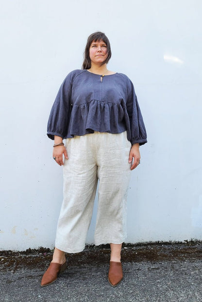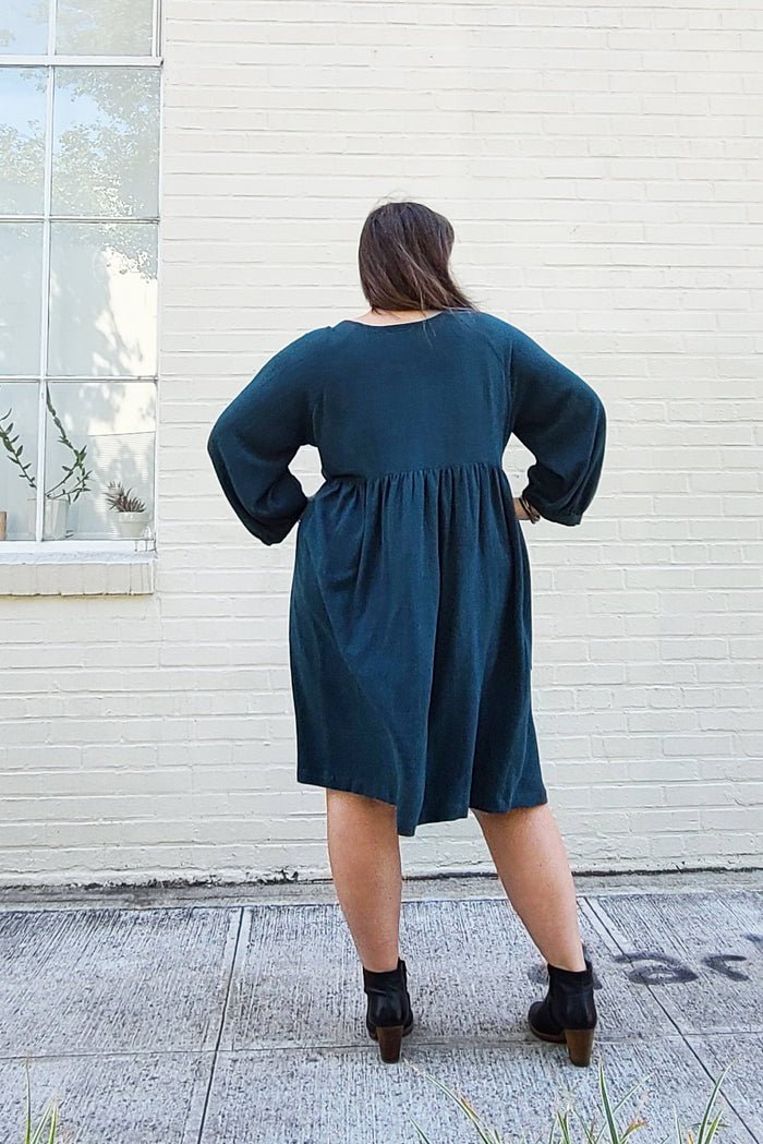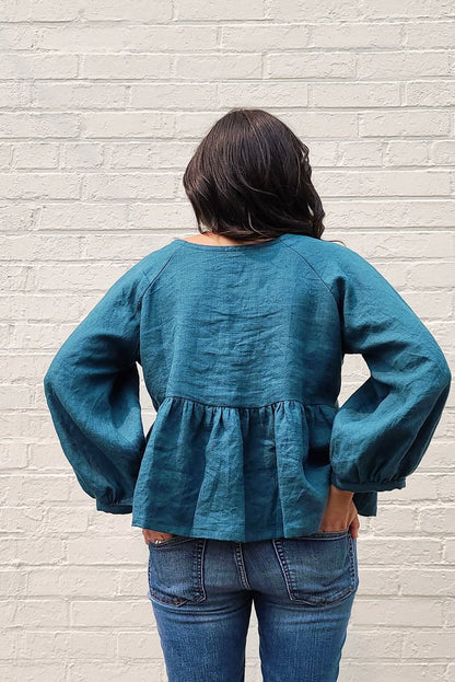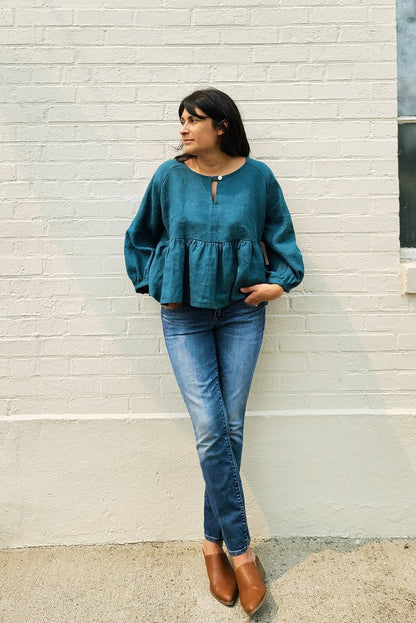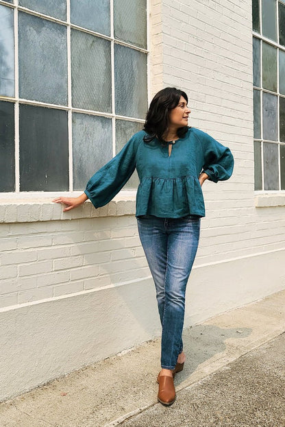 The Romey Gathered Dress & Top pattern is inspired by our beloved Remy Raglan pattern. Beginning with the signature Remy keyhole neckline and loose fit, we shortened the waistline into an elegant empire waist with a gathered skirt or peplum and billowy gathered sleeves at bracelet length. Both dress versions include patch pockets.