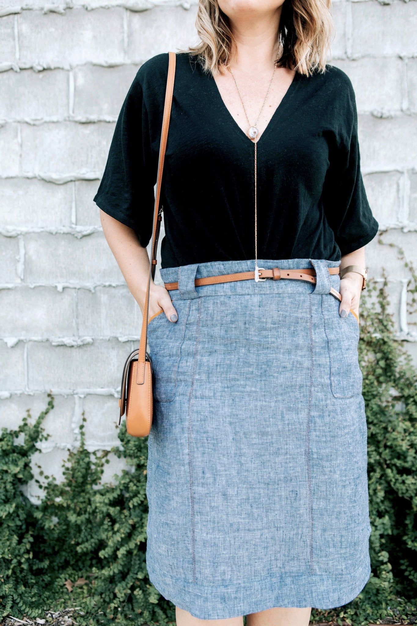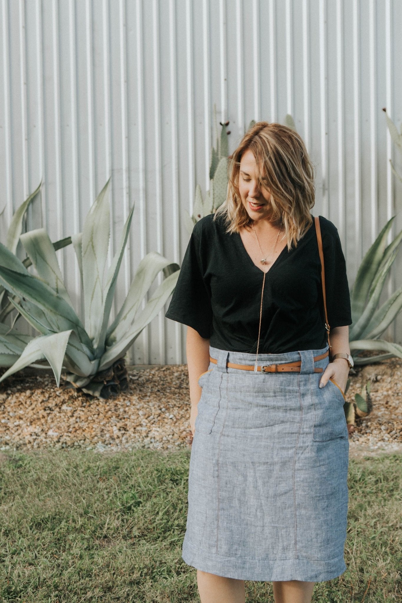 This skirt comes in two lengths. The above the knee version (mini) and below the knee (midi). It's a simple shape skirt, but with lots of room to add personal touches like adding piping to the front panel or pockets.