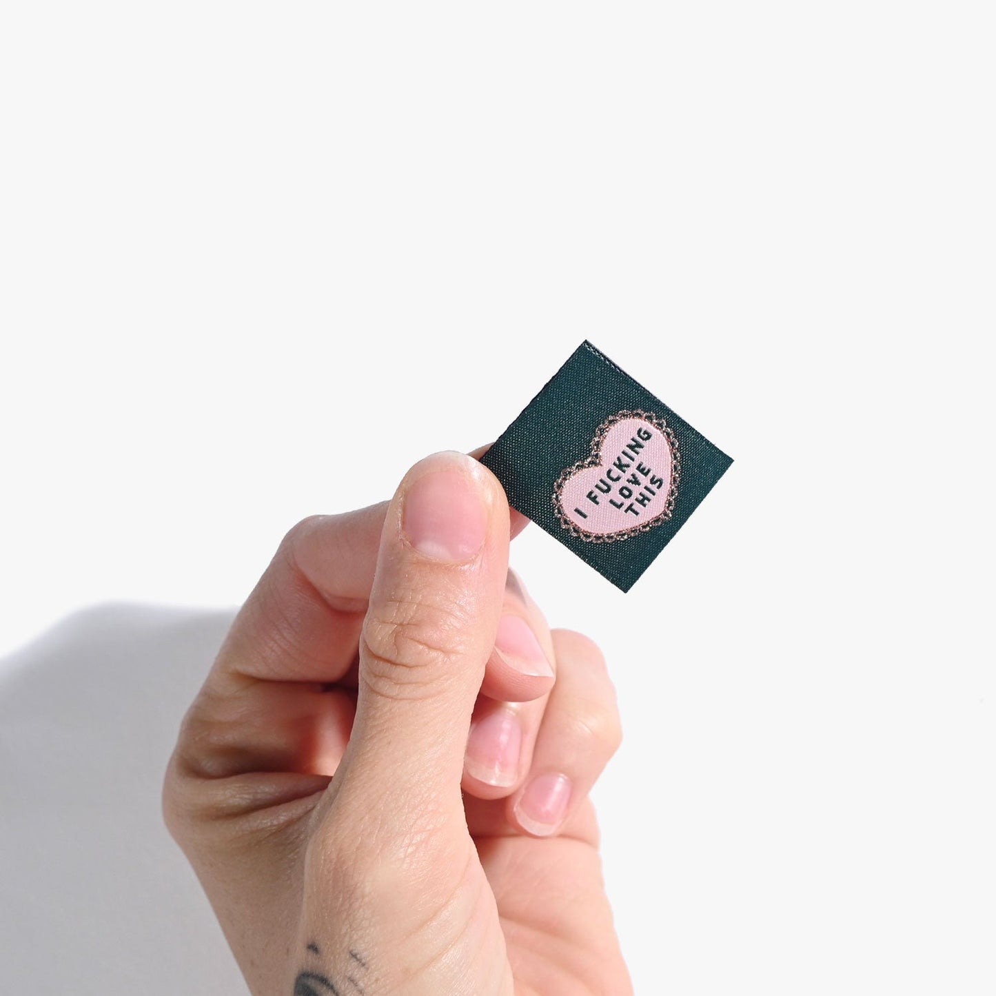 "I Fucking Love This" - 26mm x 30mm (including seam allowance) | Forest Green, Pale Pink and Metallic Rose Gold