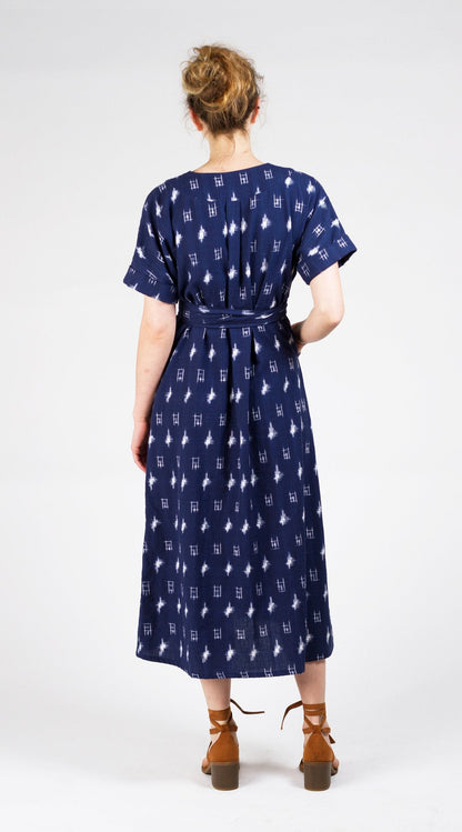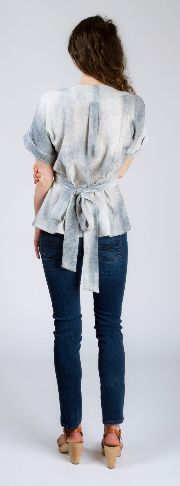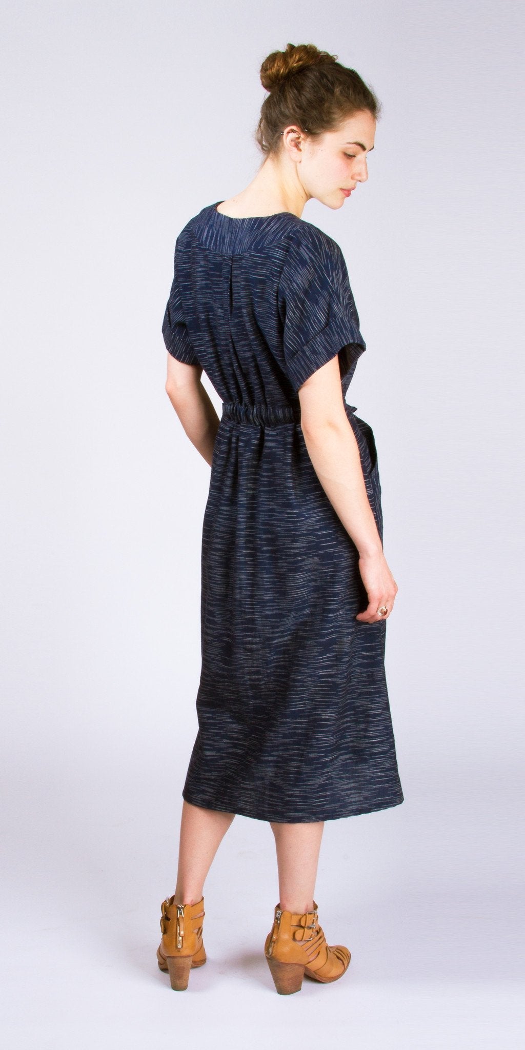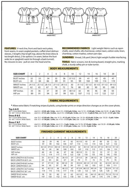 Flattering and easy to wear, the Tea House is a great pattern with a variety of options for different looks. Use a silk or rayon fabric with some drape for a vintage inspired look while a cotton yarn dyed stripe can lend a more modern feel. The Tea House features: a V-neckline with front and back neck yokes, front seaming, in-seam angled pockets (for the dress versions), a back neck box pleat, cuffed dolman short sleeves and two different tie options. Views A, B, & C feature wide under the bust, inseam ties that can be tied behind the back or doubled around to the front. Views D, E & F feature a spaghetti waist tie that threads through a back tunnel and can be tied in the front or for just a bit of waist definition, tied behind the back. There are three different length options - views A & D are hip length tops, views B & E are above the knee length dresses and views C & F are tea length dresses. There are no closures to sew - just slip it on over the head and tie!