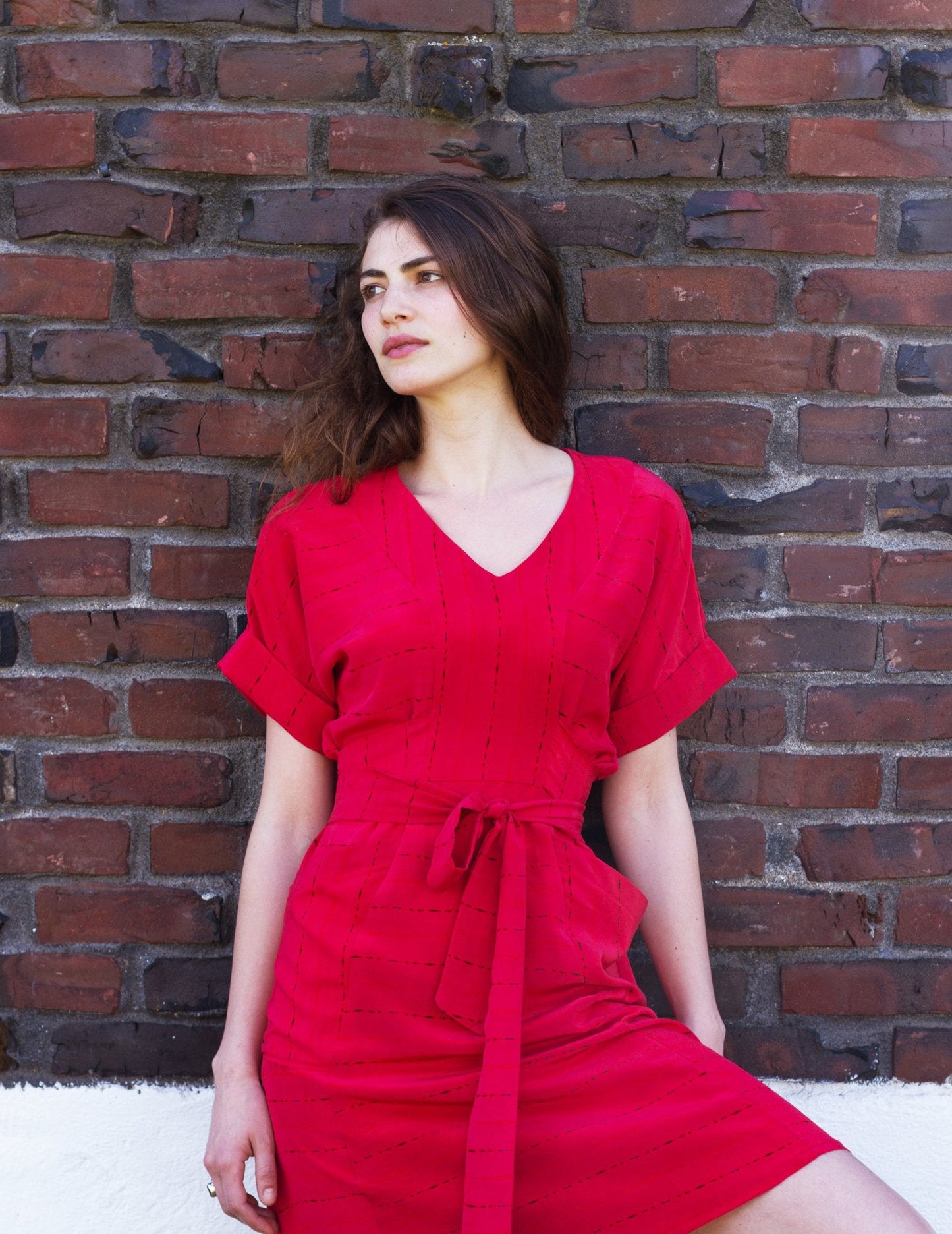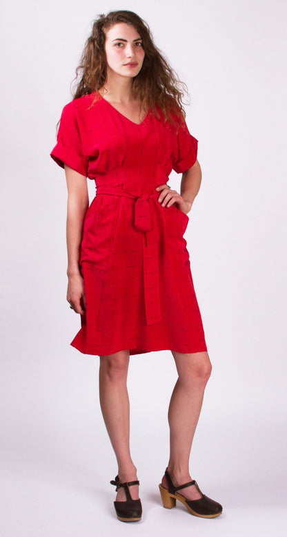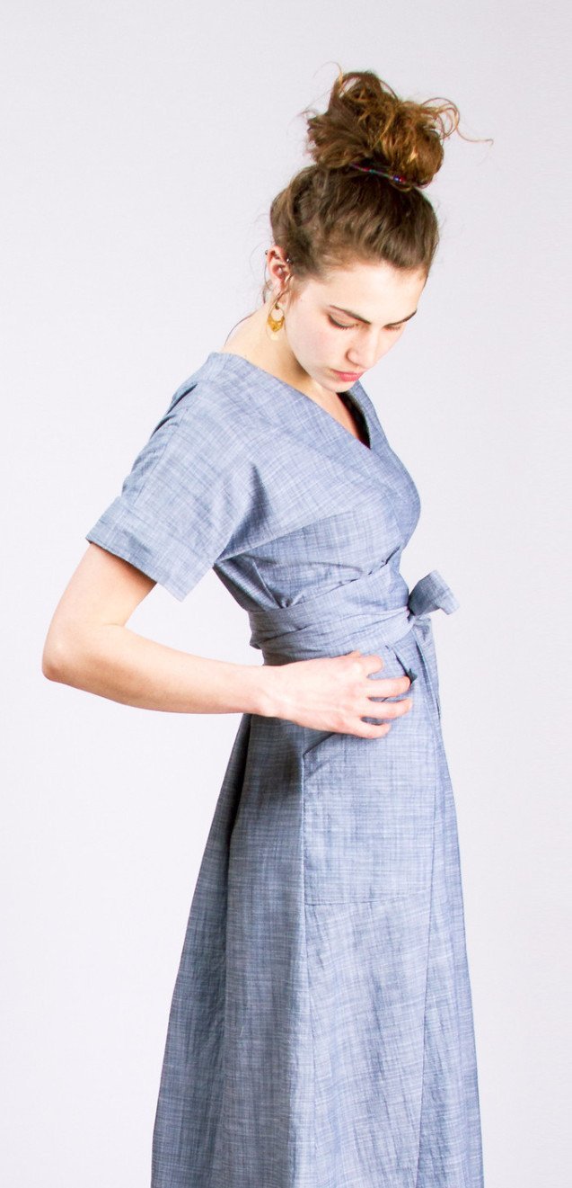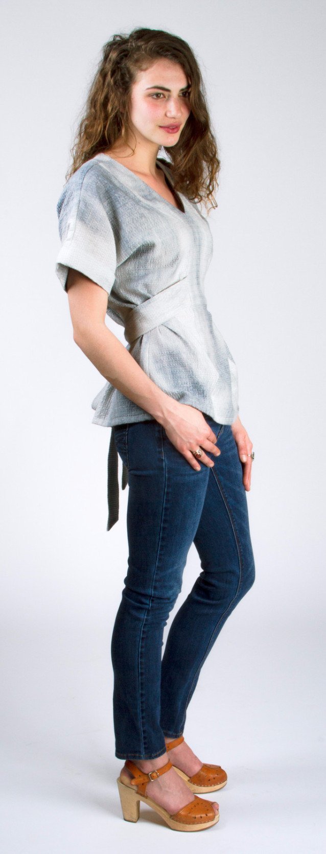 Flattering and easy to wear, the Tea House is a great pattern with a variety of options for different looks. Use a silk or rayon fabric with some drape for a vintage inspired look while a cotton yarn dyed stripe can lend a more modern feel. The Tea House features: a V-neckline with front and back neck yokes, front seaming, in-seam angled pockets (for the dress versions), a back neck box pleat, cuffed dolman short sleeves and two different tie options. Views A, B, & C feature wide under the bust, inseam ties that can be tied behind the back or doubled around to the front. Views D, E & F feature a spaghetti waist tie that threads through a back tunnel and can be tied in the front or for just a bit of waist definition, tied behind the back. There are three different length options - views A & D are hip length tops, views B & E are above the knee length dresses and views C & F are tea length dresses. There are no closures to sew - just slip it on over the head and tie!
