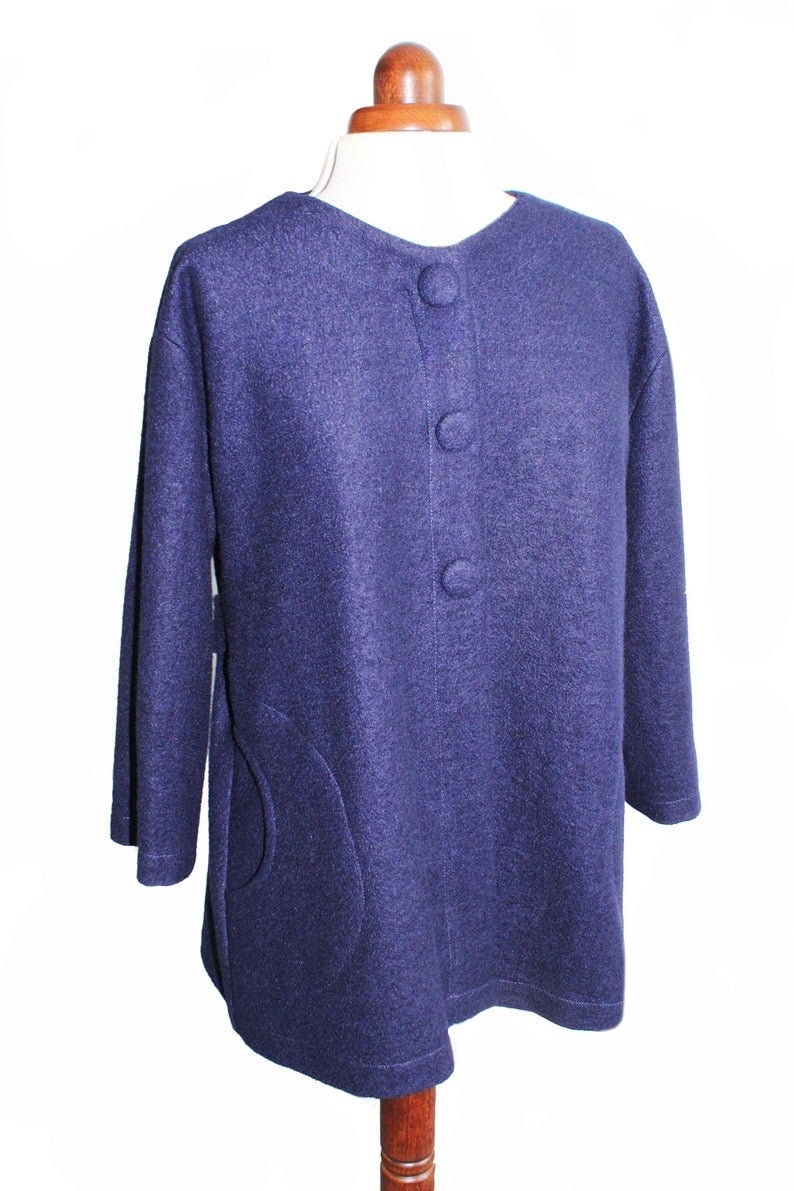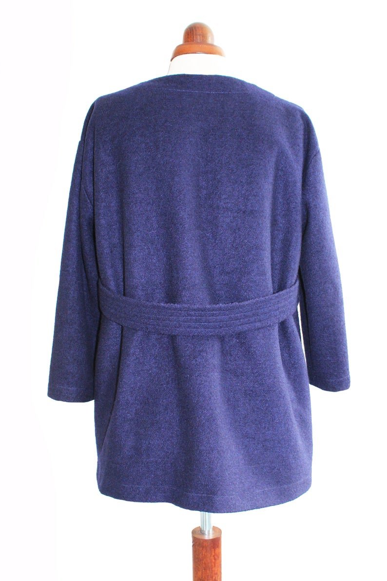 Loose fitting three quarter sleeve coat or shorter length jacket with covered buttons and snap fasteners, side pockets feature and optional back belt.