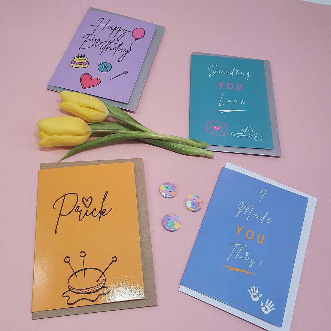 The card features a vibrant colour palette with a fun sewing theme. The card is left blank inside for you to choose the occasion! The design is printed on an A6 sized glossy card with a weight of 350 gsm. Each card comes with an envelope all enclosed in a cellophane wrap to keep it safe until used!