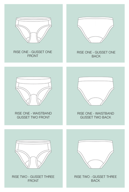 GARMENT SPECIFICS The Perfect Period Panties are low to mid rise full coverage period undies. Create your perfect gusset by combining front and back lengths according to your desired coverage, then choose your favorite rise and waistband for totally custom period pattern!
