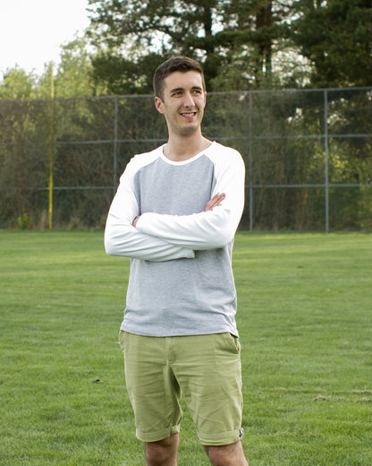 A versatile raglan t-shirt sewing pattern to create every day casual wear. The attractively curved raglan seams paired with a relaxed crew neckline serve to create the flattering appearance of a strong chest. The sleeves are slim without clinging. The body is an average fit suitable for most figures. Choose between full length sleeves or short sleeves that end mid-bicep. The hems can be sewn using a zig-zag stitch or a twin needle.
