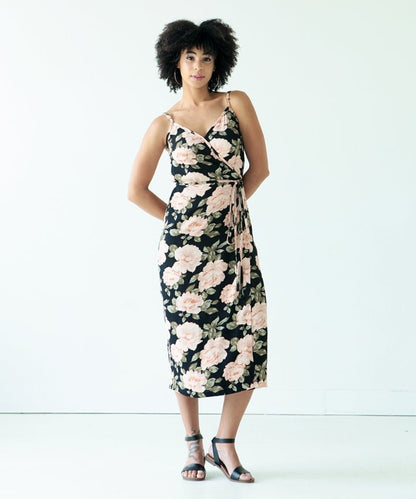 The Calvin pattern is a wrap dress and top with exposed bias binding that extends into long ties to form a bow closure. It has rings and sliders which create adjustable shoulder straps for an easy fit. View A is a short top that hits approximately two inches below the natural waist. View B is a straight dress that hits at mid calf.