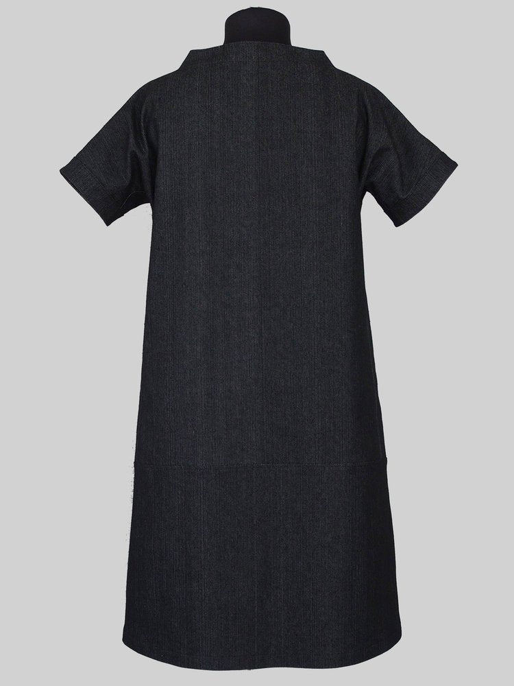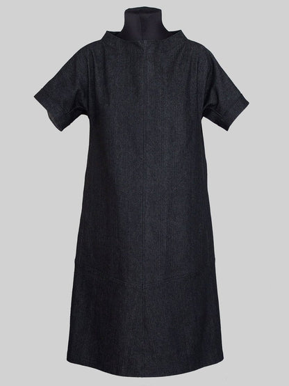 The Cap sleeve dress slips over the head, has cowl neck and cap sleeves. It features a decorative in-seam gusset all the way under arm and large front pockets.