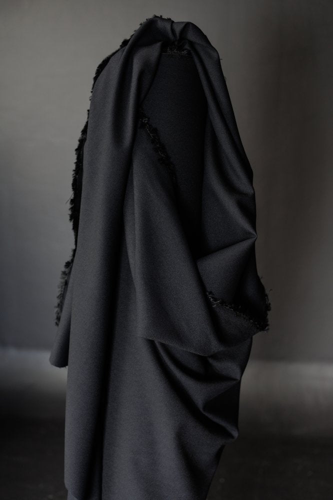 A mid weight wool/viscose blend with a beautiful crepe texture, it drapes wonderfully due to its weight. Black.