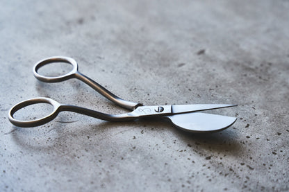 Duckbill scissors in matte steel finish with a wide flat ‘duckbill’ blade and a slightly angled handle, allowing to cut fabric very close to stitches.