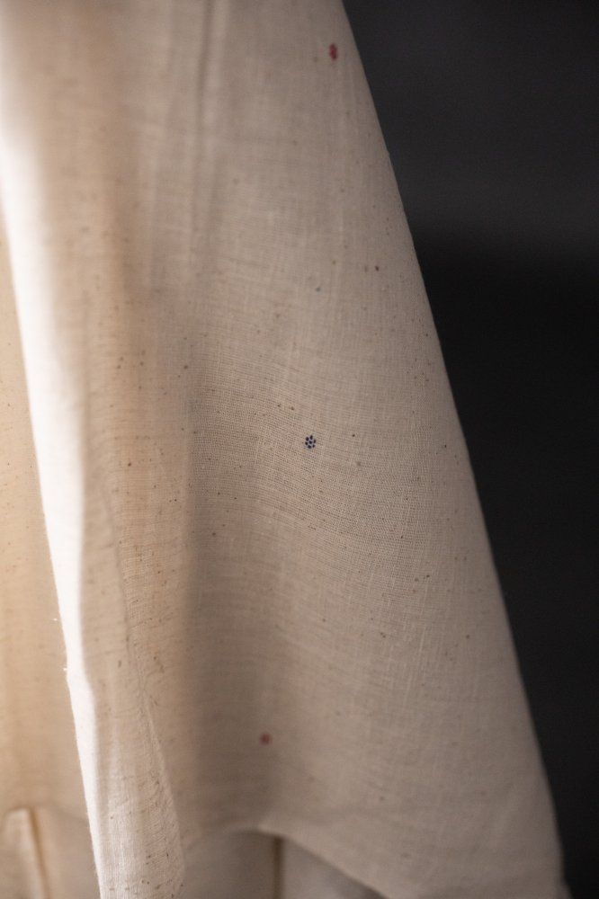 A unique handcrafted Kala cotton in natural ecru with tiny red and blue ditsy flowers woven through using extra weft technique. Extra weft is where additional weft yarns in contrasting colours, are woven through to create a motif. This yarn is woven in with the structural yarns.