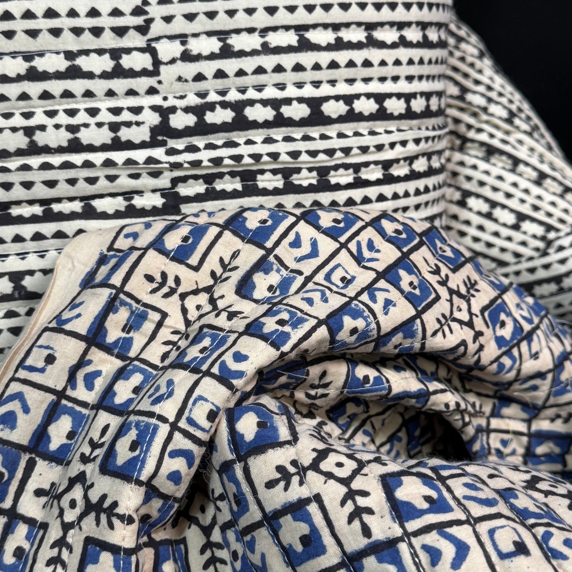 Indigo Mosaic + Ebony Echo - Quilted Bagru Indian Cotton Block Print (Reversible)