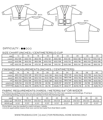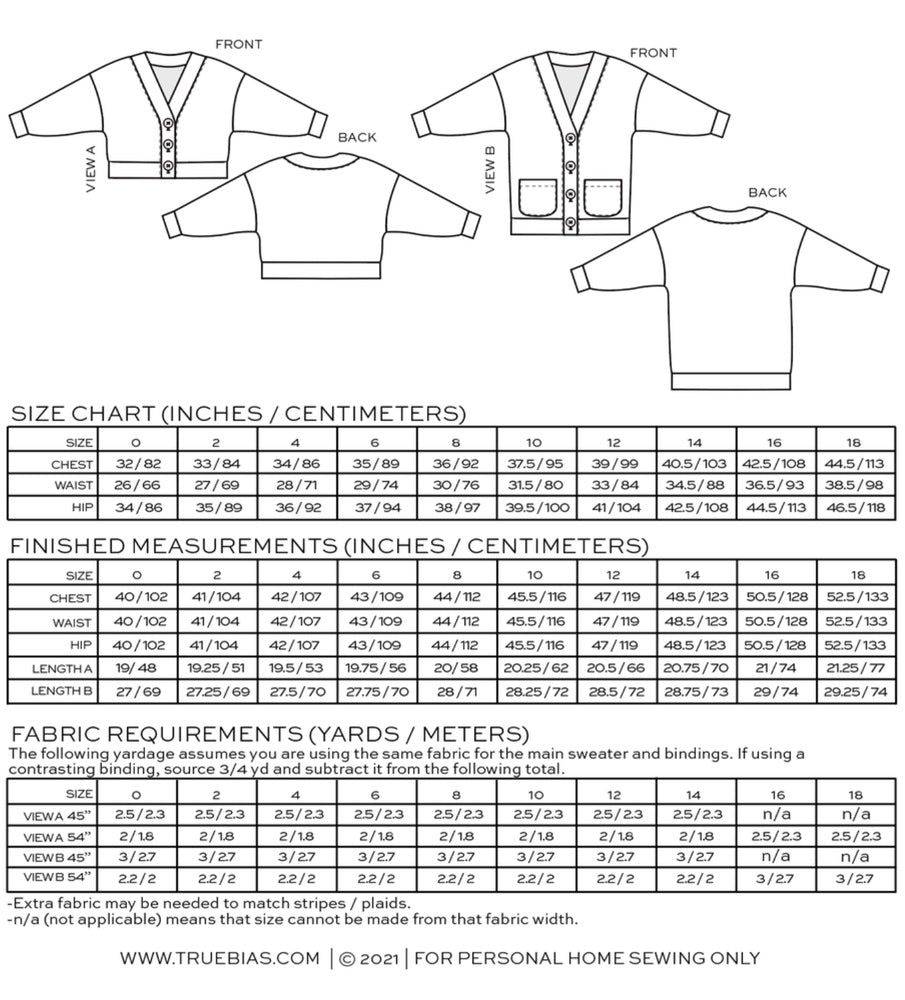 Suggested fabrics include medium weight fabrics such as sweater knit, french terry, sweatshirting, polar fleece, rib knit and boucle.