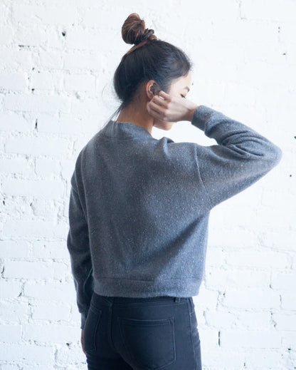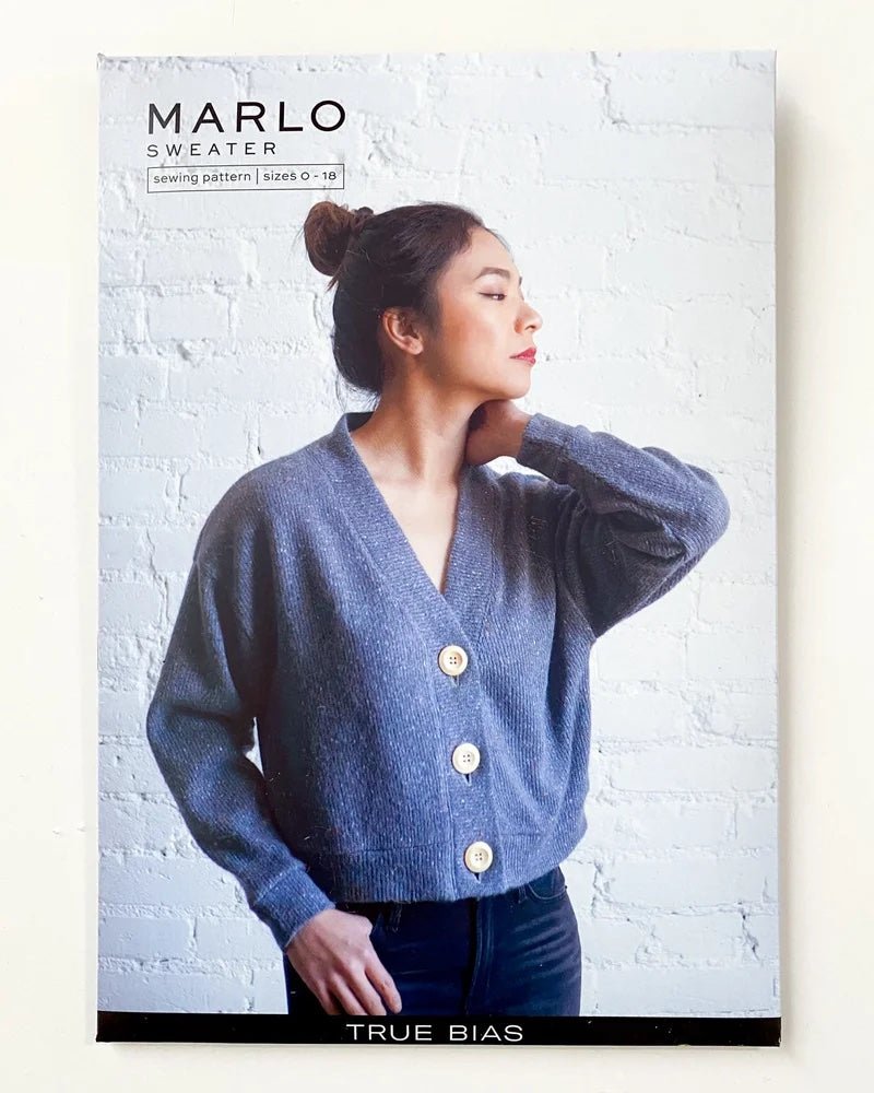 The Marlo pattern is an oversized sweater with a dropped shoulder, deep V-neck, wide bands and large buttons. View A is cropped length. View B has patch pockets and hits above midthigh.