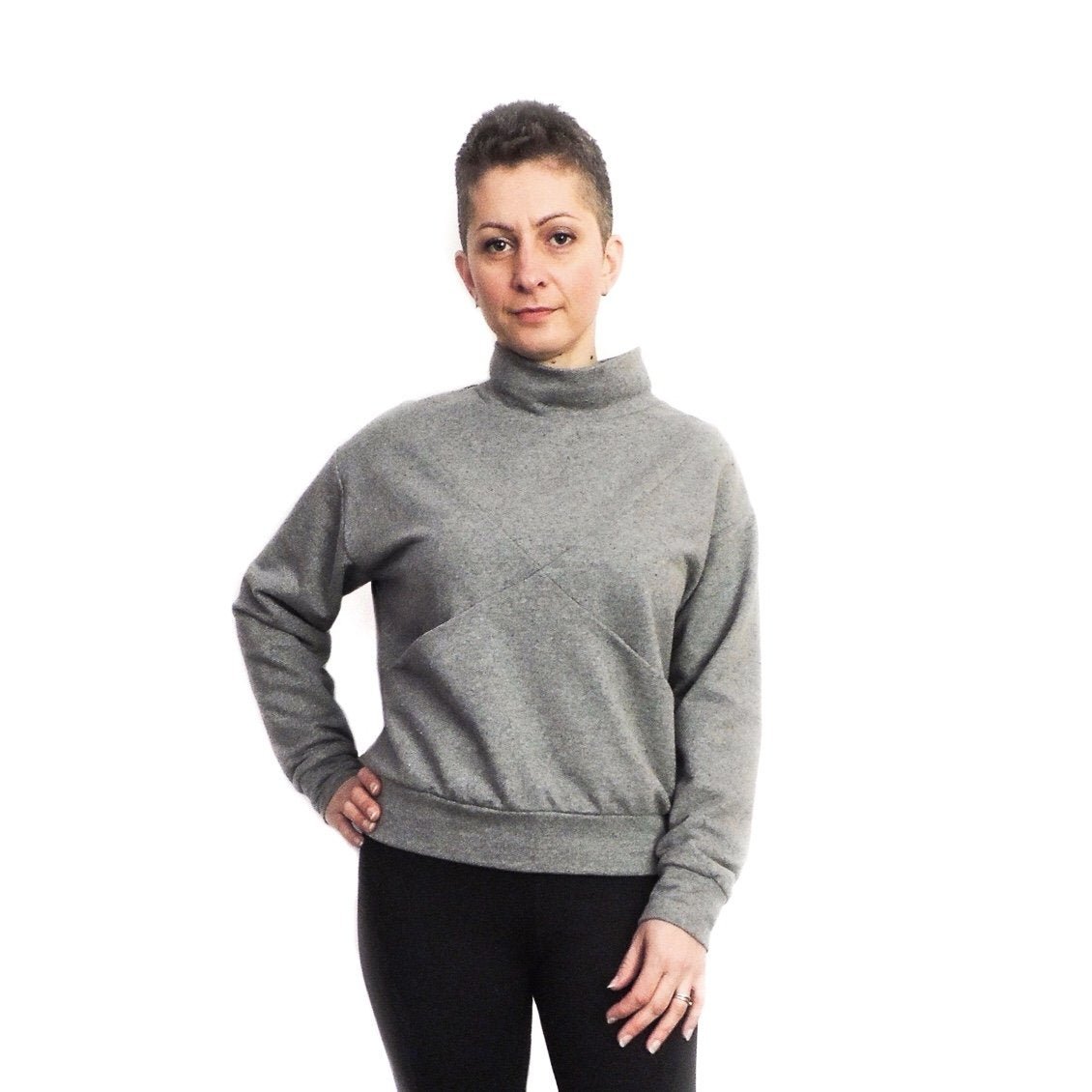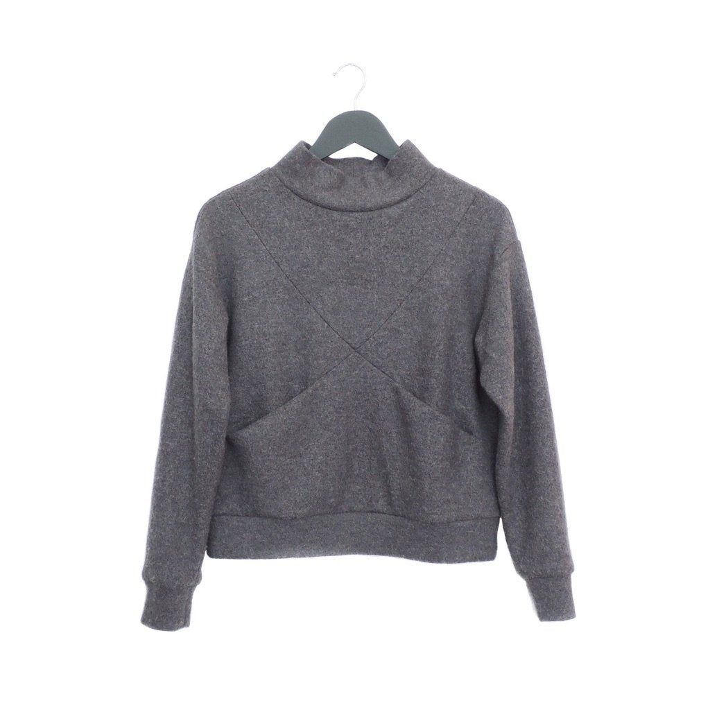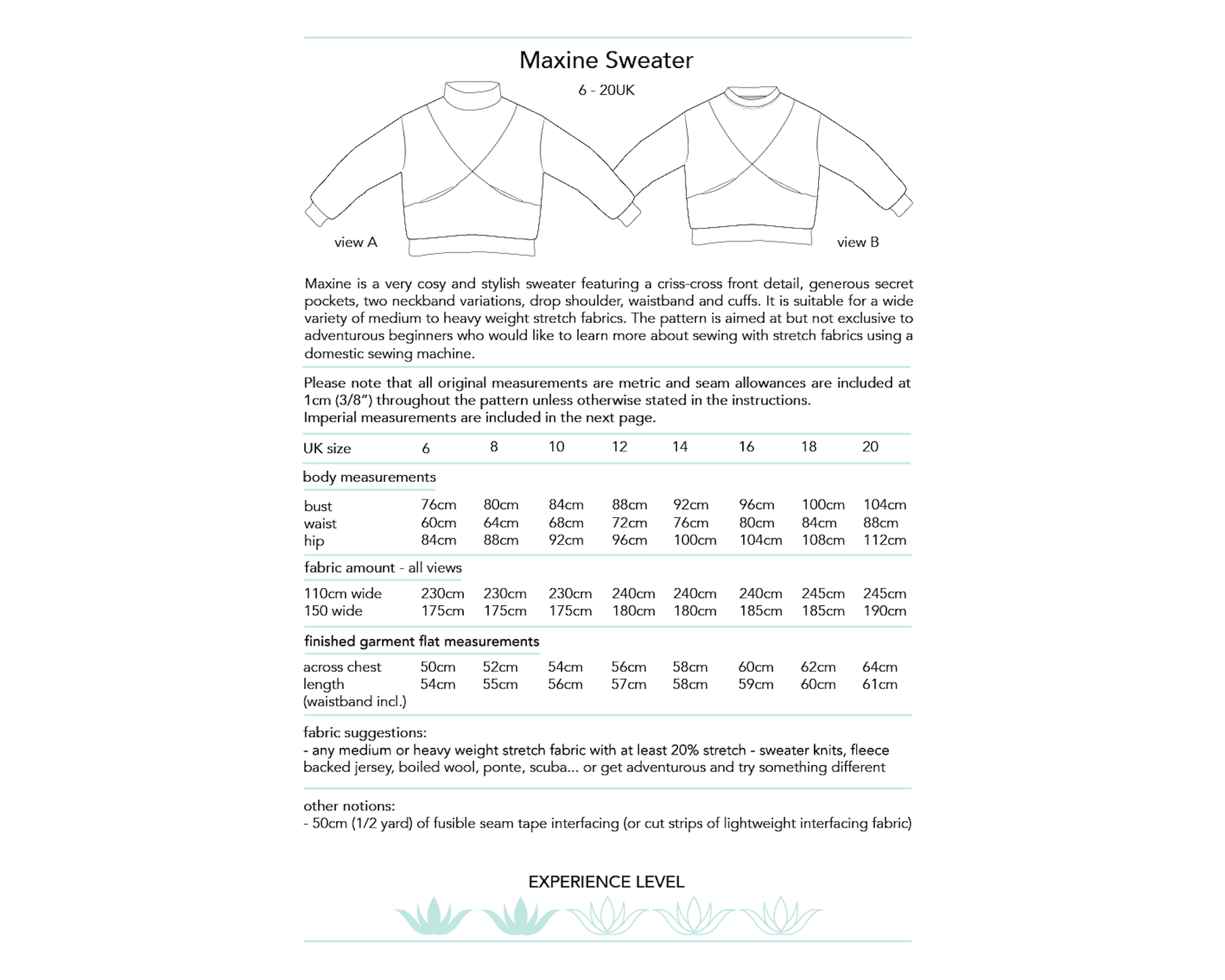 Maxine is a very cosy and stylish sweater featuring a criss-cross front detail, generous secret pockets, two neckband variations, drop shoulder, waistband and cuffs. It is suitable for a wide variety of medium to heavy weight stretch fabrics. The pattern is aimed at but not exclusive to adventurous beginners who would like to learn more about sewing with stretch fabrics using a domestic sewing machine.