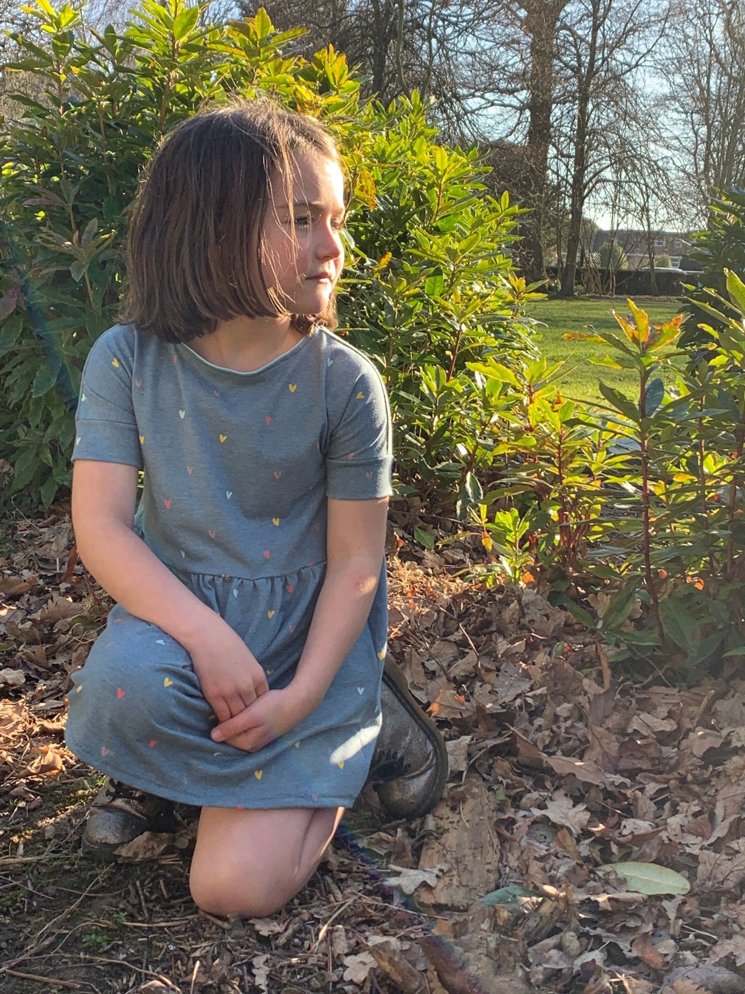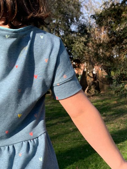 The Molly Dress is a simple and easy to wear jersey dress. It has a gathered waist, two neckline options, and dolman sleeves. Use a contrast fabric for the skirt to make a standout out outfit!