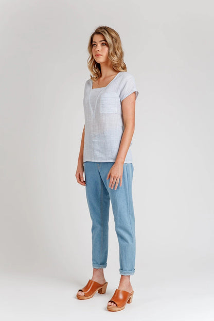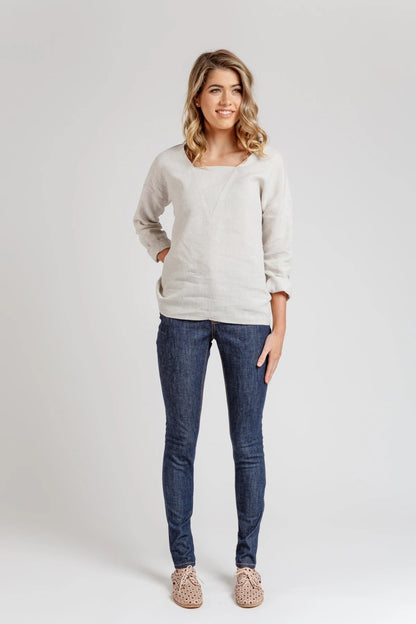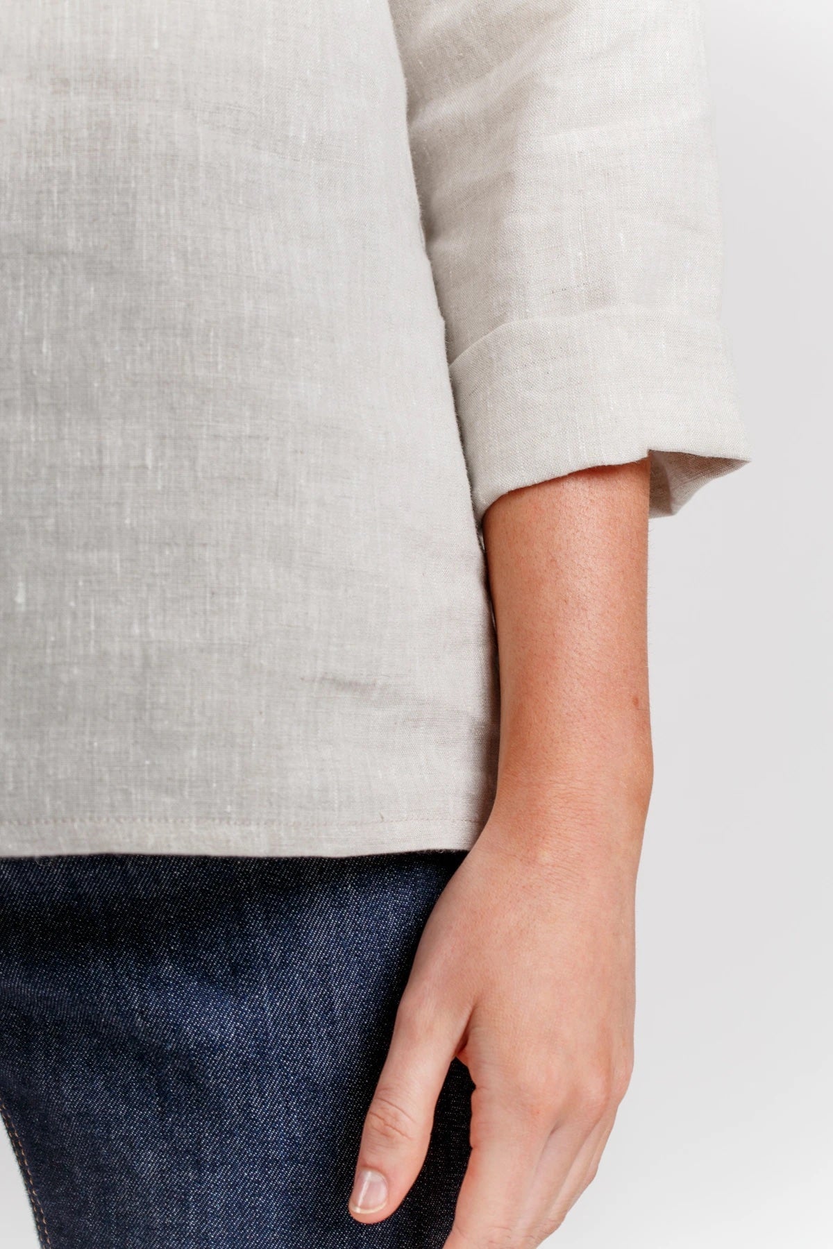 Olive is a relaxed silhouette top or dress with v-insert. Pattern features a drop shoulder, multiple sleeve finishes, dress or top variations, and optional breast patch pocket.