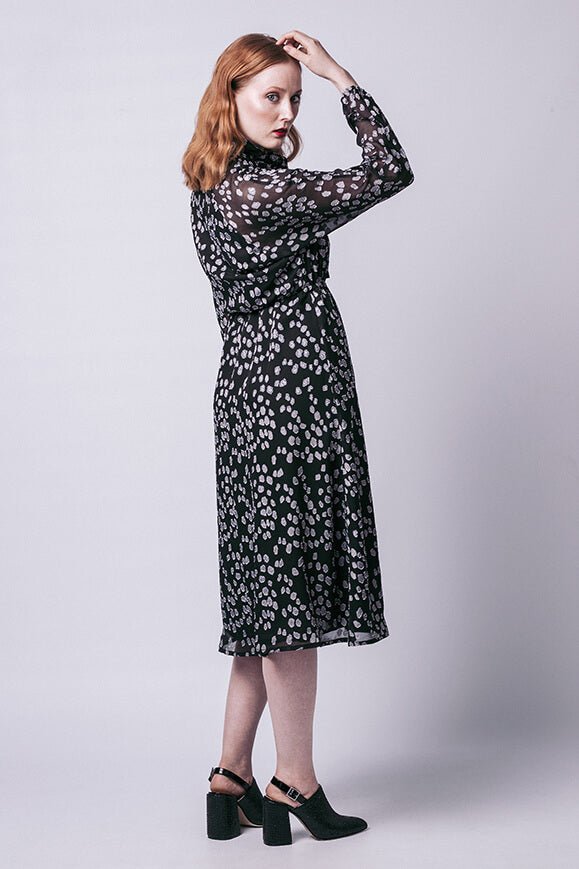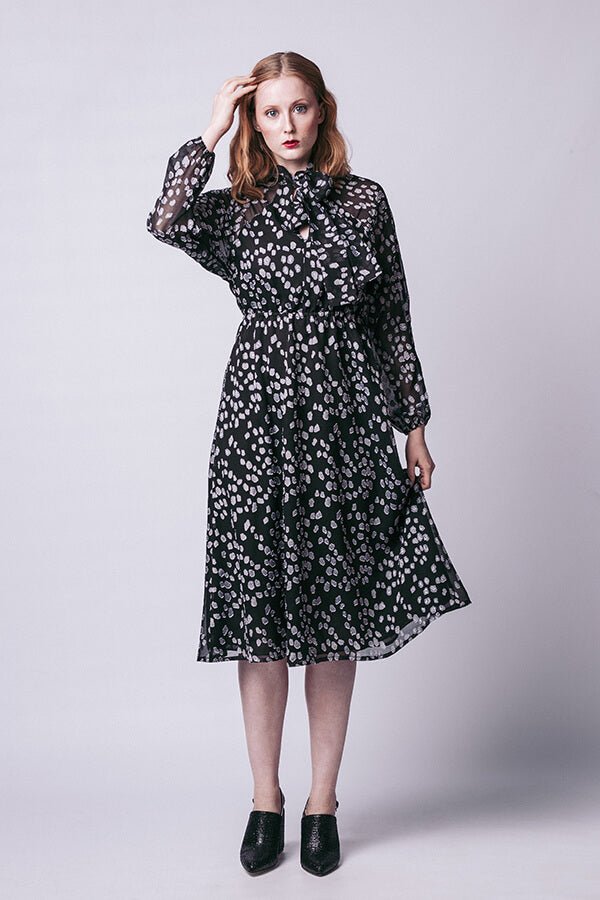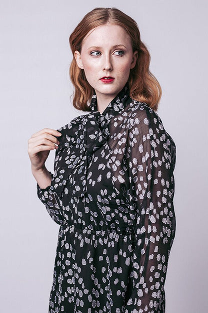 • Choose a light weight, non-stretch fabric with drape for both the blouse and the dress. Suitable fabrics for the shell of the dress are chiffon and similar translucent fabric, and stretch charmeuse for the lining.