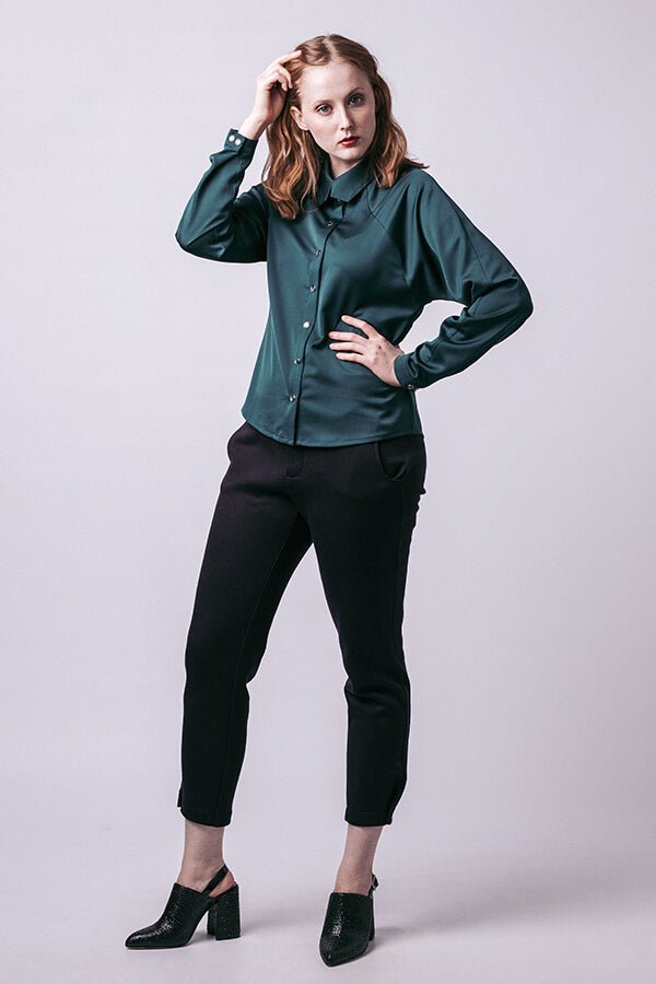 • The blouse collar is triangular, and the narrow cuffs have pleats that fasten with snaps