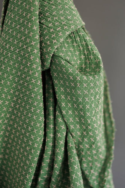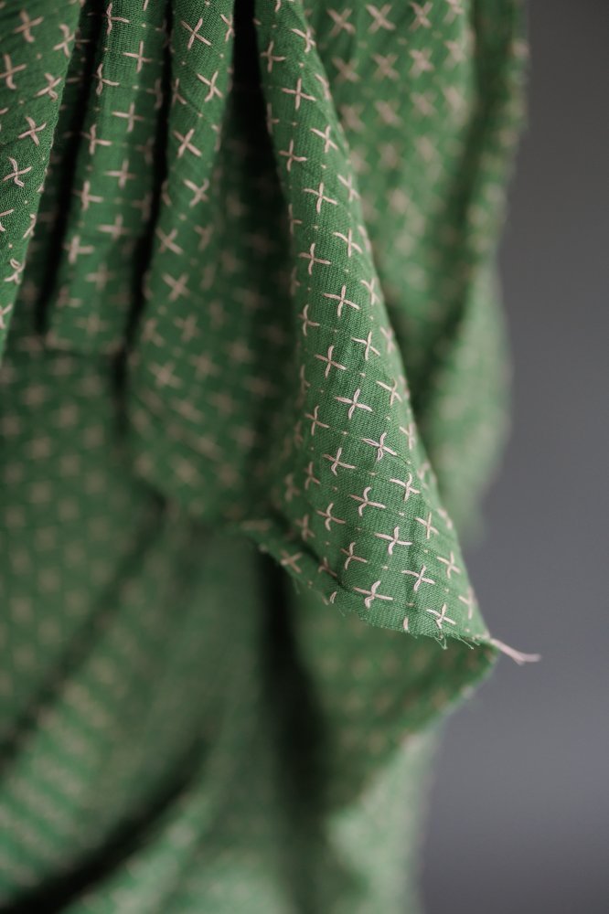 A unique Indian cotton with a crinkled gauzy texture in pea green with cross stitch detailing in pale pink.