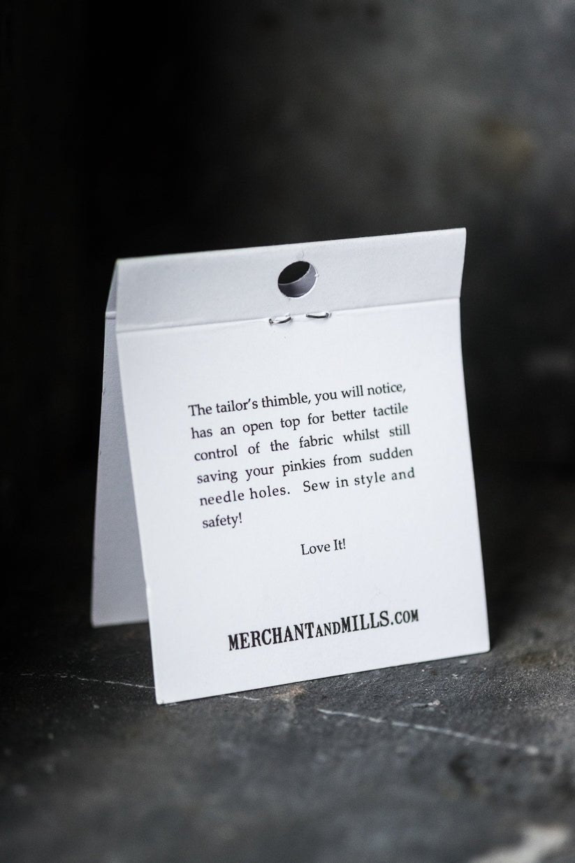 Solid brass tailor’s thimble with a hole at the top – engraved ‘Merchant & Mills’.