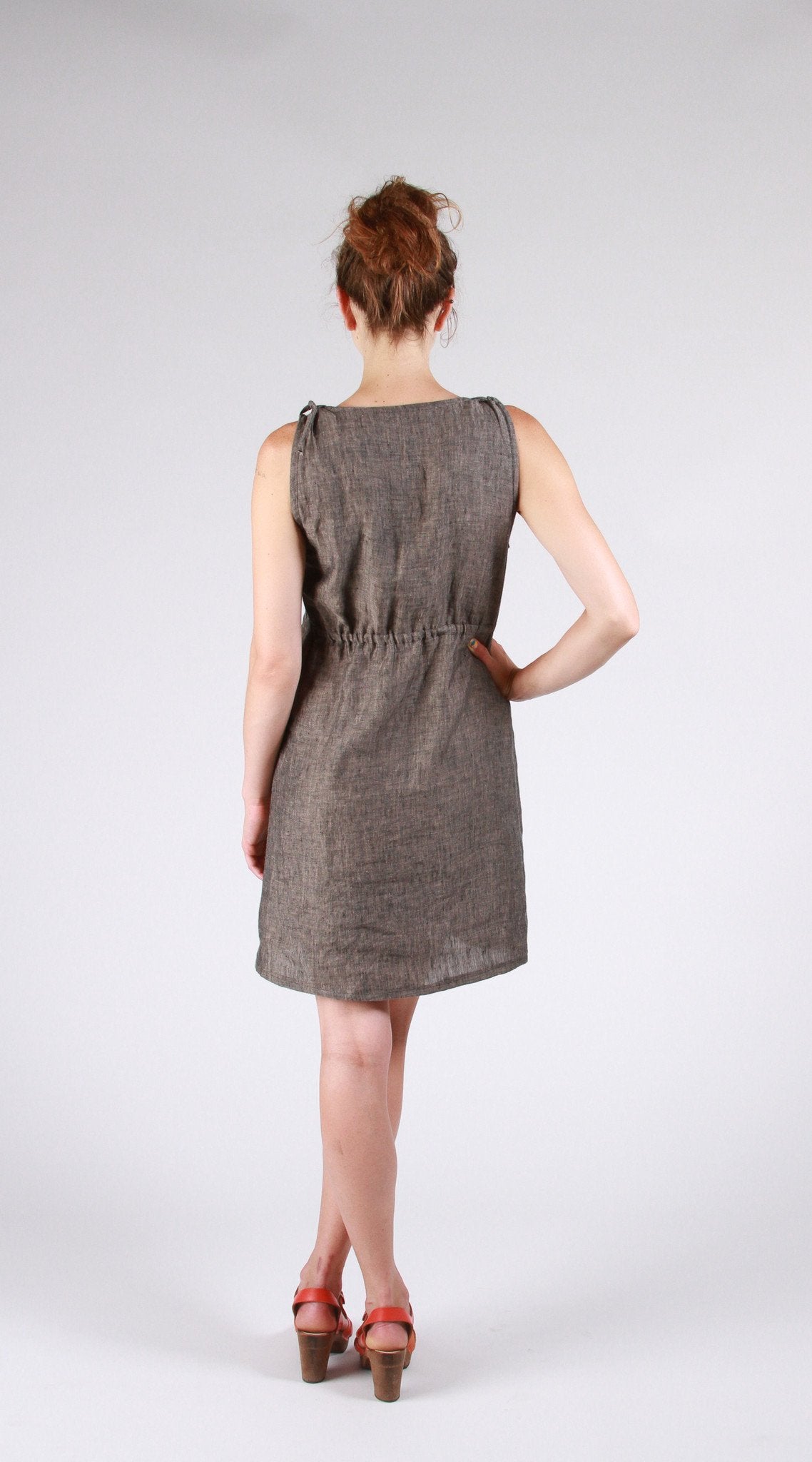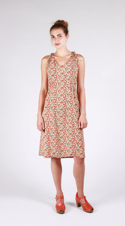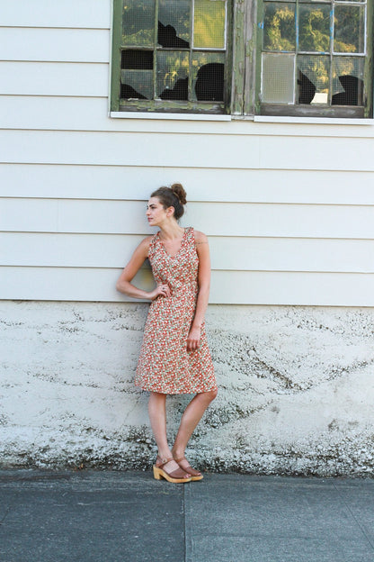 The Mississippi Avenue Dress or Top has a very feminine, flattering and easy style. As a sleeveless style, it lends itself to spring and summer dressing however, it makes a great transition piece when paired with a cardigan, tights and boots. It can have a vintage look to it when sewn in a fabric such as rayon challis or something with some drape to it. It can have a more modern look to it when sewn in a crisp linen or cotton. Any way you fashion it, it's a great style. It features a V-neckline, spaghetti shoulder ties, an elastic almost empire waist (slightly higher than the natural waistline) and has a front panel that creates a slimming and interesting design feature. There are 3 options for length - Dress C falls a little below the knee, Dress B falls above the knee and Top A falls below the high hip. This is a beginner level pattern.