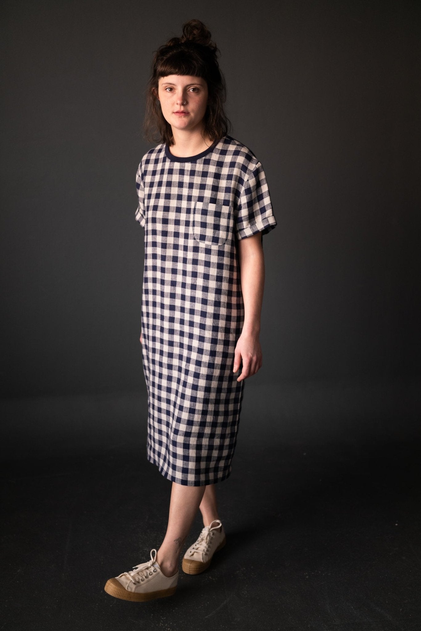 Fabrics pictured: All of the men’s fabrics that have now sold out, but these were laundered linens. The stripe version was a cotton double gauze. Elwen wears the Tee in Frontier Forest and the dress version in Calamity Blue. There is a lengthen line on the pattern if you would like to extend it into a dress. We extended ours by 40cm, meaning we needed 80cm more fabric. We would suggest going for an oversized fit if making the dress as the side seams are completely straight.