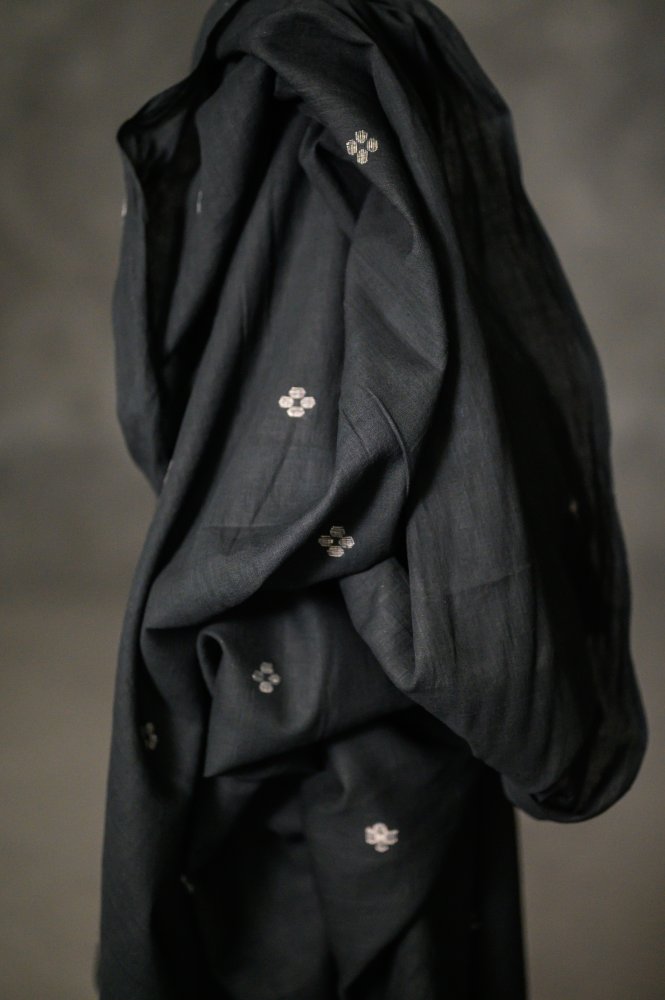 A black handloom cotton with small white Jamdani flowers. Jamdani is fine muslin cotton with small geometric motifs, it’s a highly skilled weaving technique that has been practiced in India for centuries. This cloth comes alive once washed, it gets much softer and has a beautiful slub and texture.