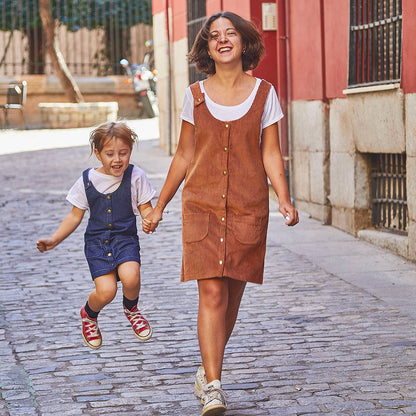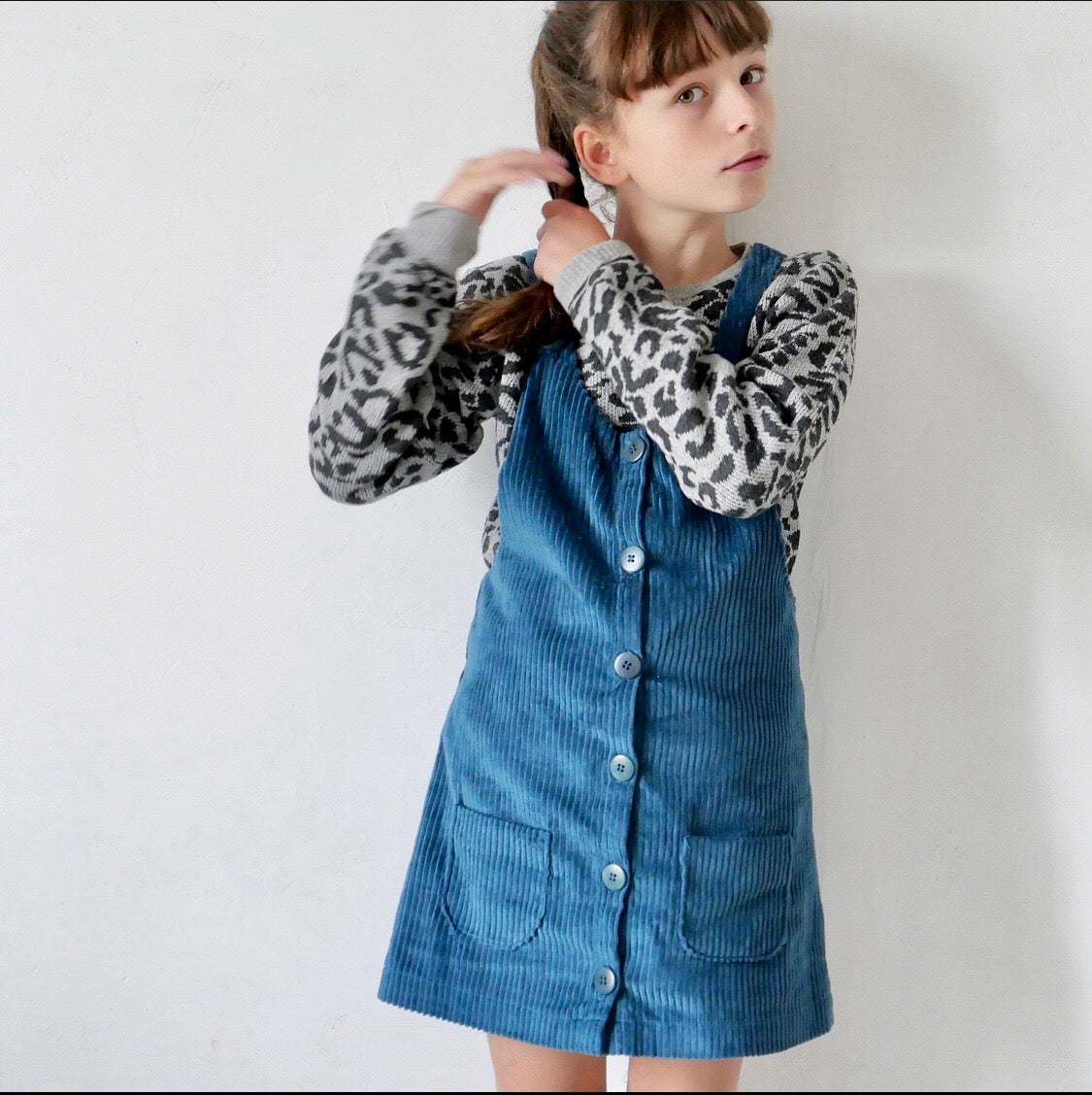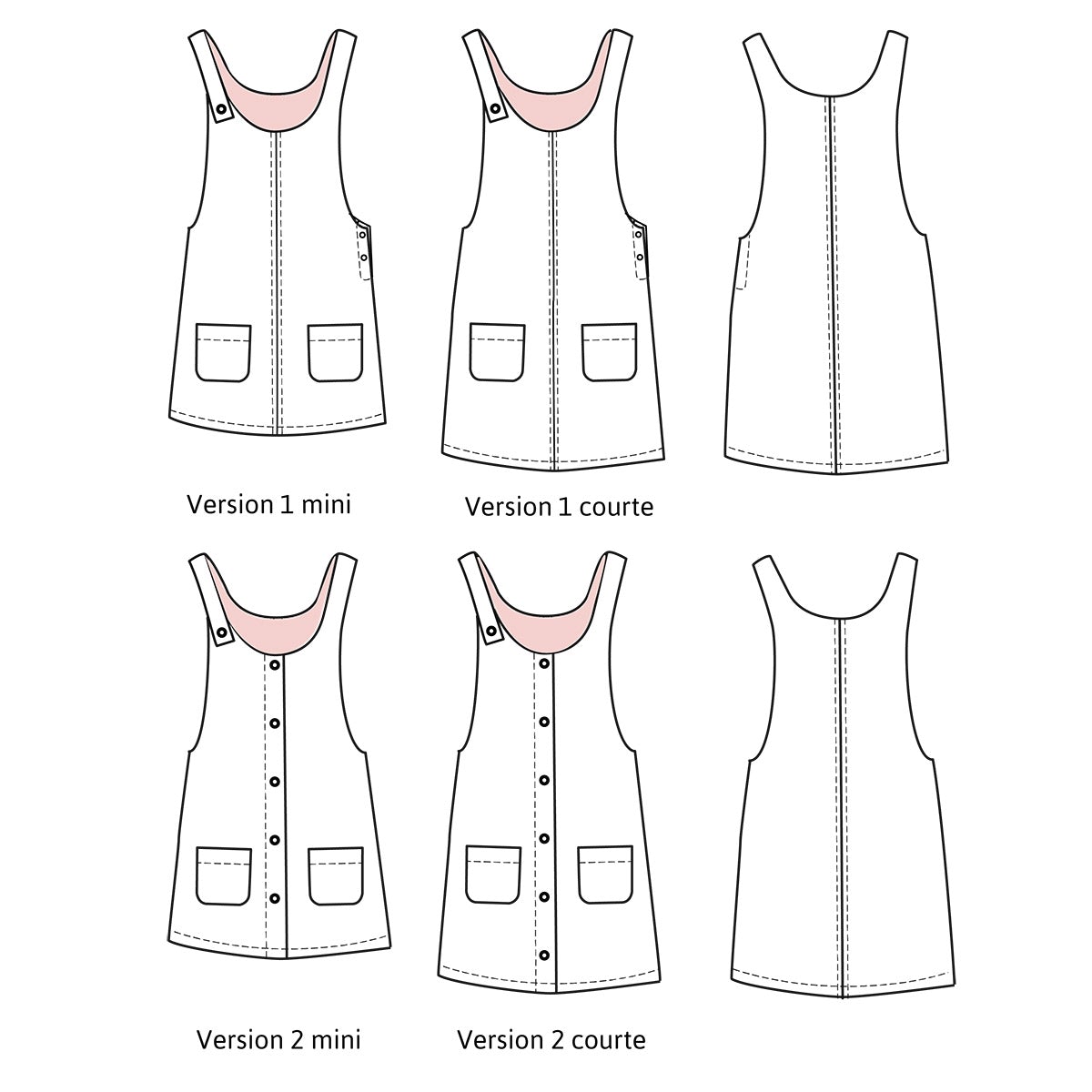 Similar back for the 2 shapes. Finishes with front and back facings. One openable strap. Optional patch pockets. Deep  armholes  and neckline. To be worn over a tee-shirt, sweater or blouse. Dress suitable for all seasons.