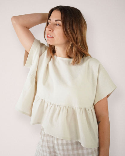 The Wave Float Top is a fun and playful easy to wear top with beginner sewists in mind. The top is designed to have a wide oversized fit with a dropped peplum in the front and a high peplum in the back. This style is intended to be cropped offering a lovely swingy silhouette and pairs perfectly with high waisted pants. The Wave Float Top pattern is a wonderful choice for beginners to practice basic sewing techniques.
