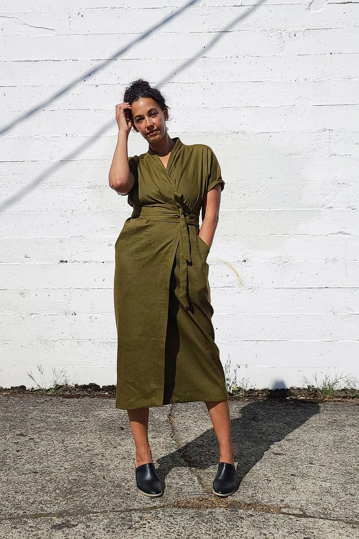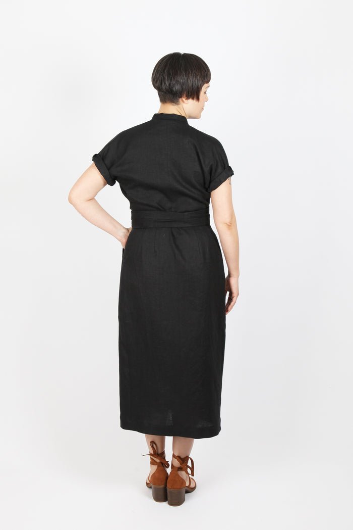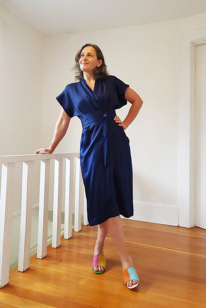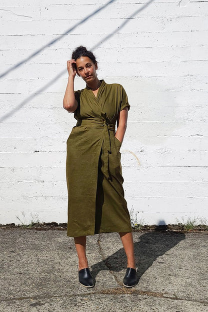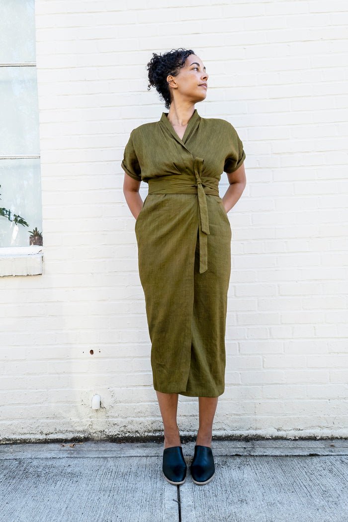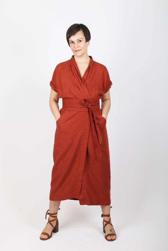 The Wildwood Wrap Dress is a shawl collar wrap dress with a detachable belt. It features waist and shoulder pleats, a slim skirt and deep pockets. Two sleeve options and two hem lengths give you several options to make your Wildwood Wrap Dress your own.