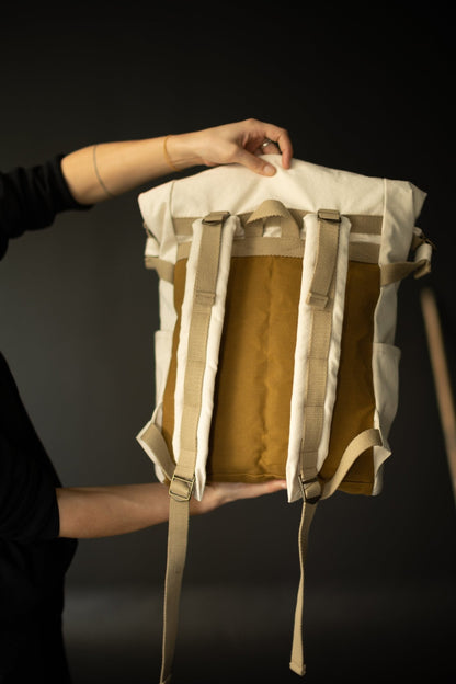 Francli Day Pack made using 25mm Sand Webbing, made in 8oz Aki (not available for trade but Duck Canvas Tan would substitute) and 12oz Organic Sanded Twill Stanley Tan.
