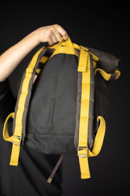Francli Day Pack using 25mm Mustard Webbing, made in Chocolate Organic Cotton Oilskin.