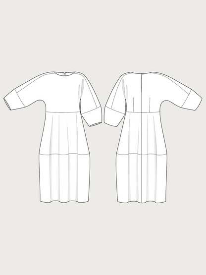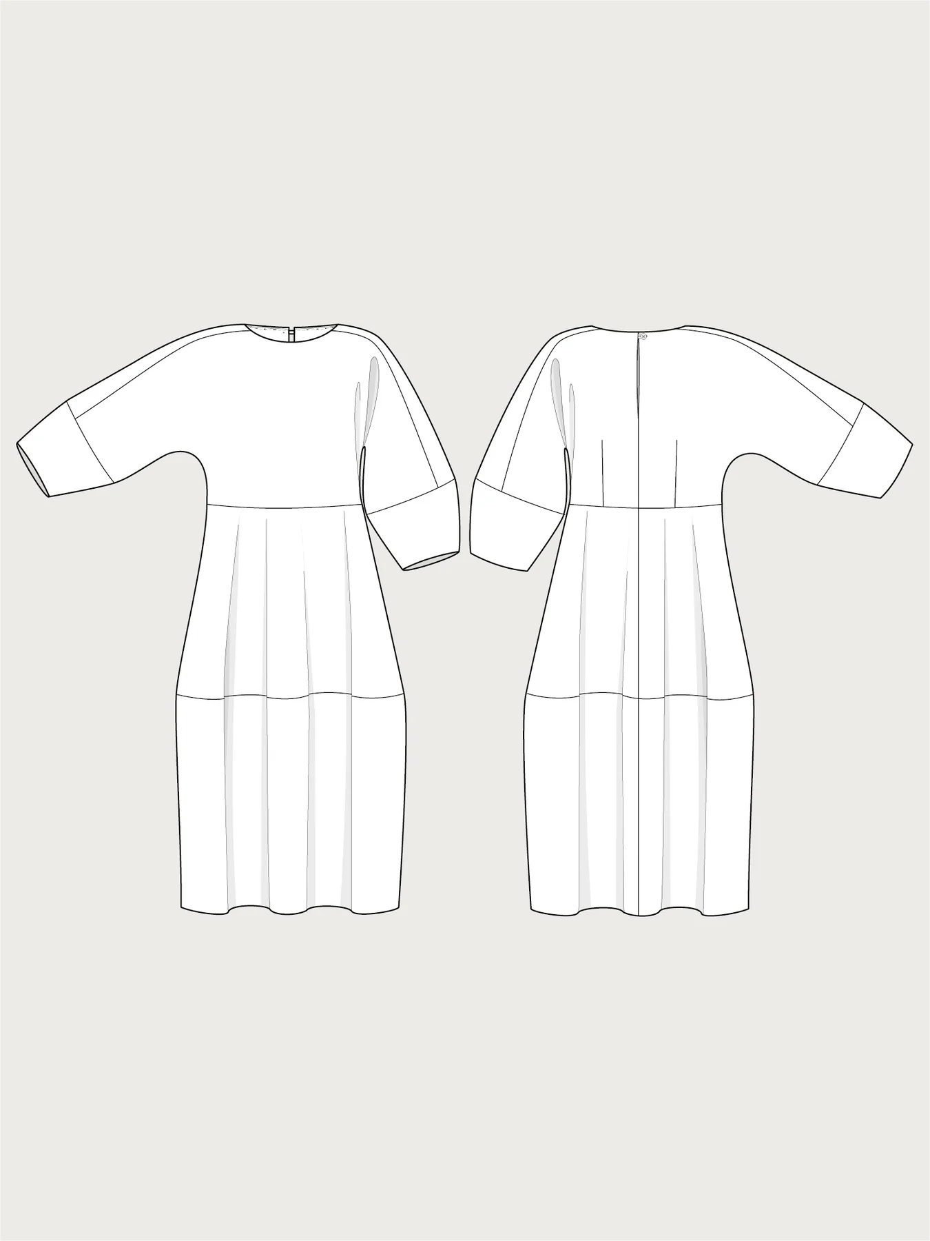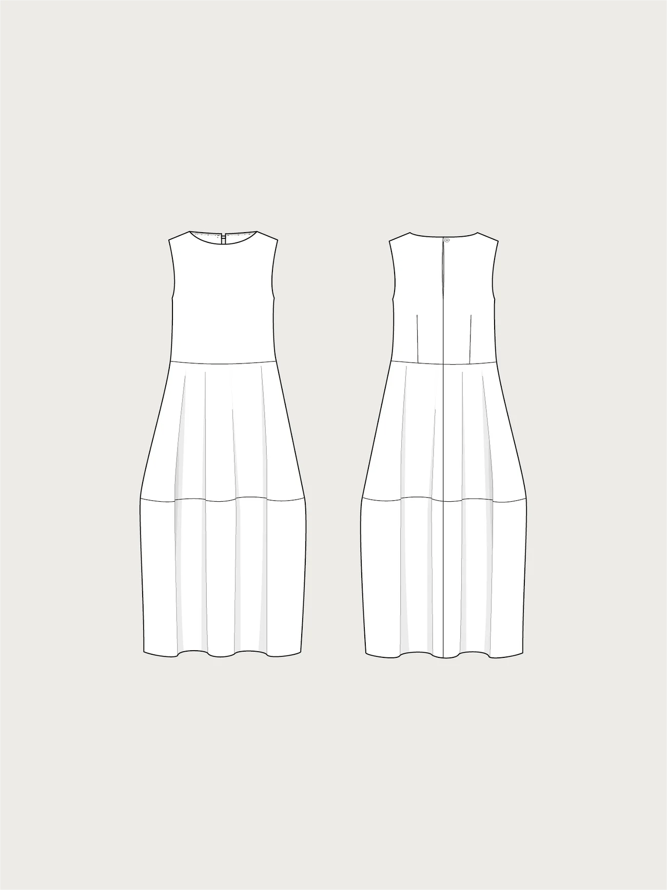 Barrel dress offers ample space and an intriguing silhouette. It comes with a midi skirt with a barrel-like shape and can be sewn with sculpted sleeves that complement the skirt's form, or it can be sleeveless. The sleeveless version is a perfect addition to your summer wardrobe!