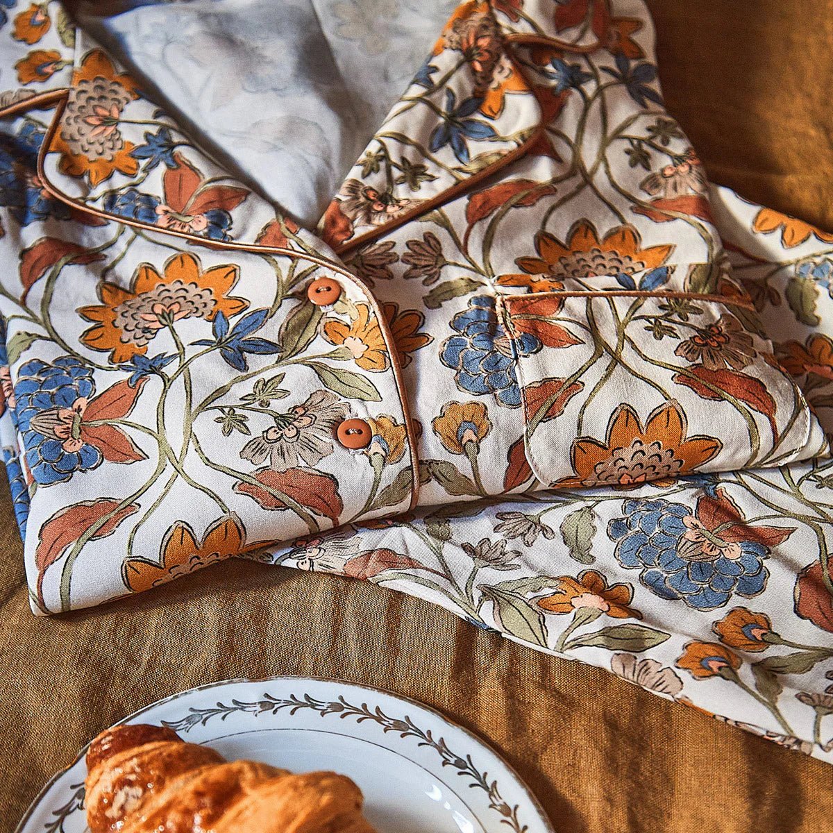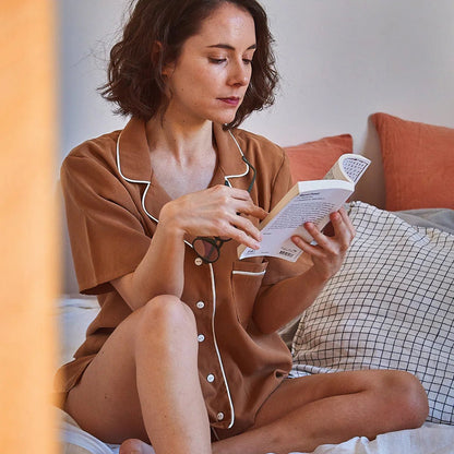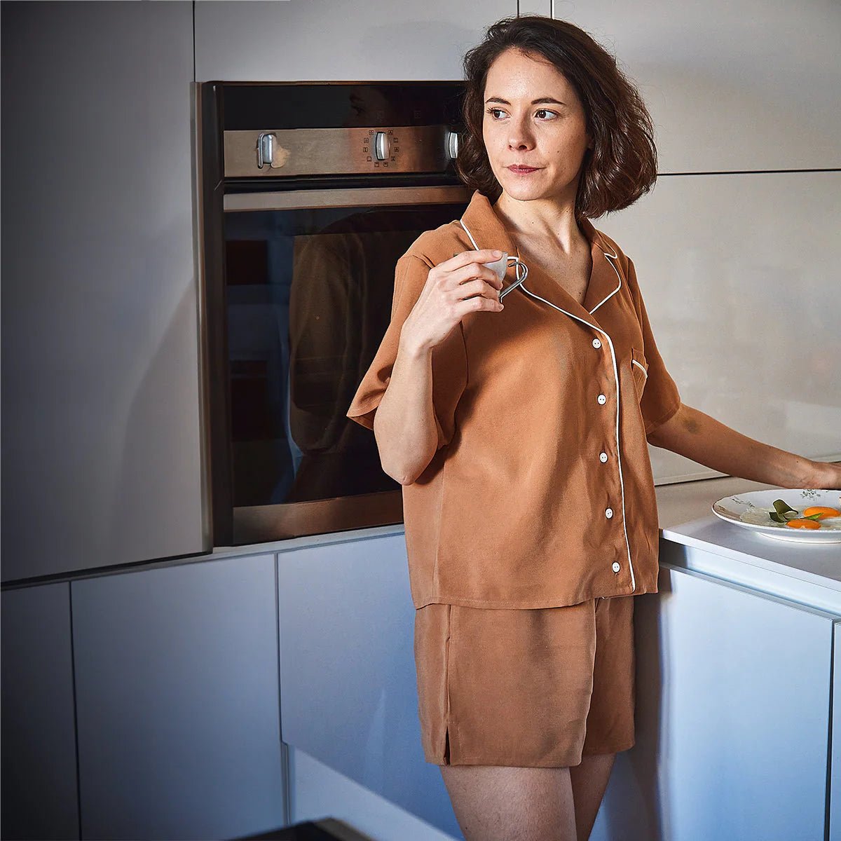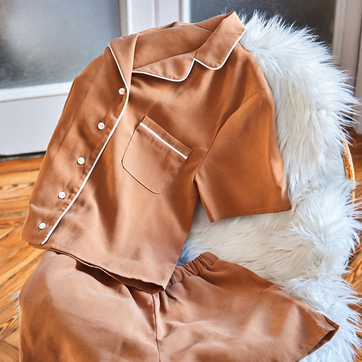 Budapest is a pajamas pattern for women featuring a short, loose-fitting top with a notched collar, and a wide bottom with an elasticated waistband and side pockets. The top can be long-sleeved with cuffs or short-sleeved, and the bottom can be pants with cuffs or shorts. The set can be fully piped.