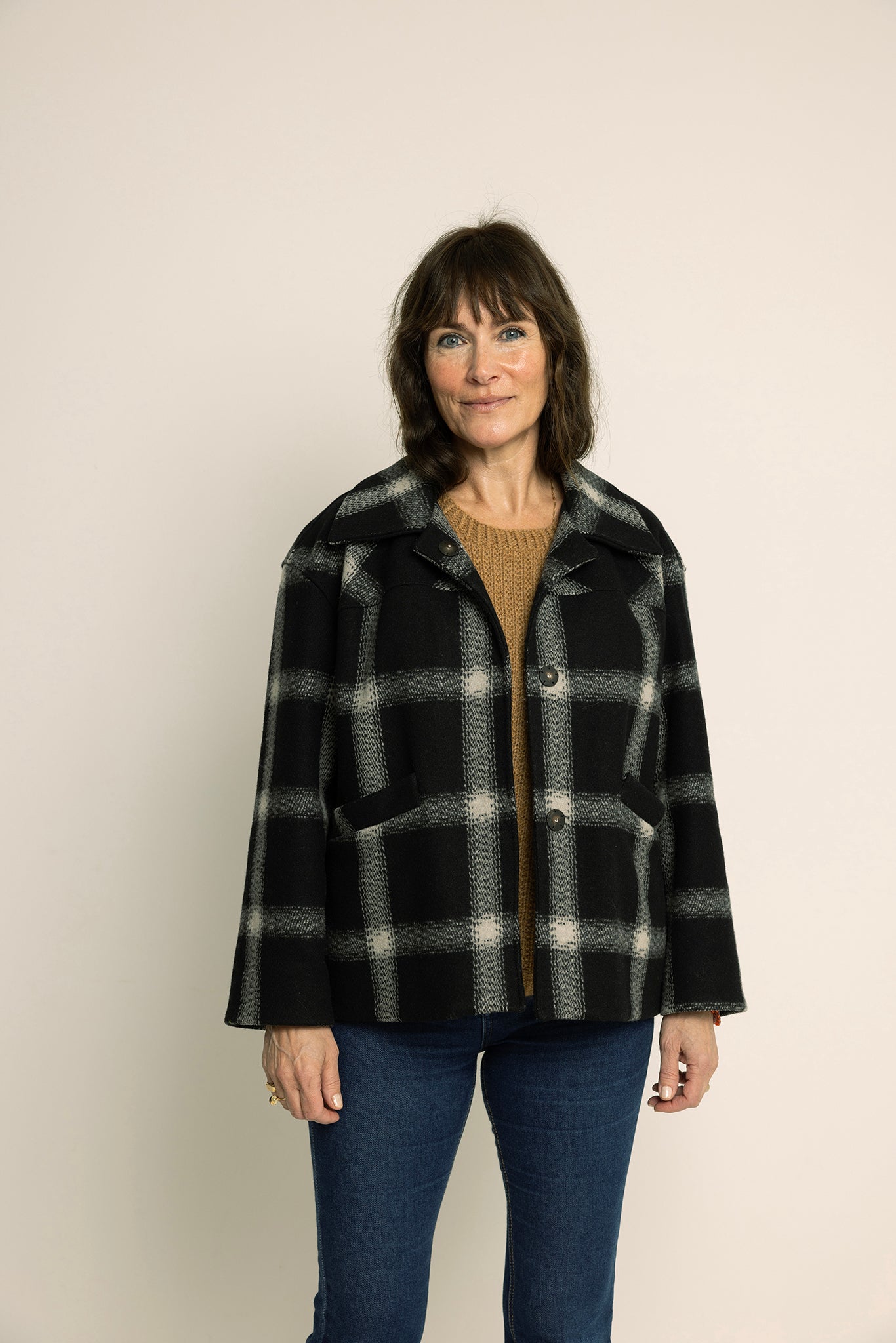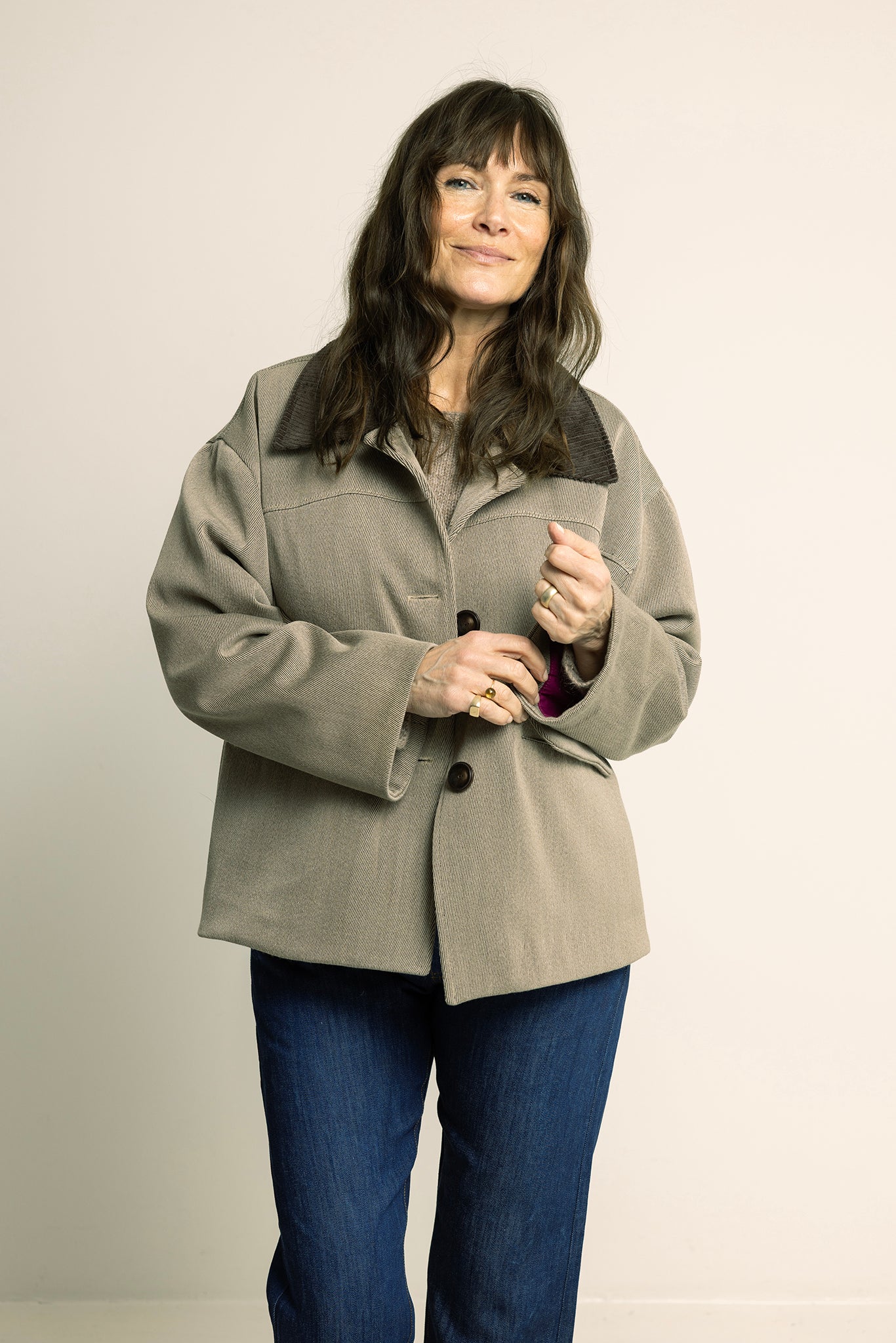 The Car Coat works beautifully in medium to heavyweight woven fabrics such as wool, boiled wool, tweed, jacquard, denim, or heavy cotton. Select a fabric with sufficient structure to maintain the jacket’s shape.