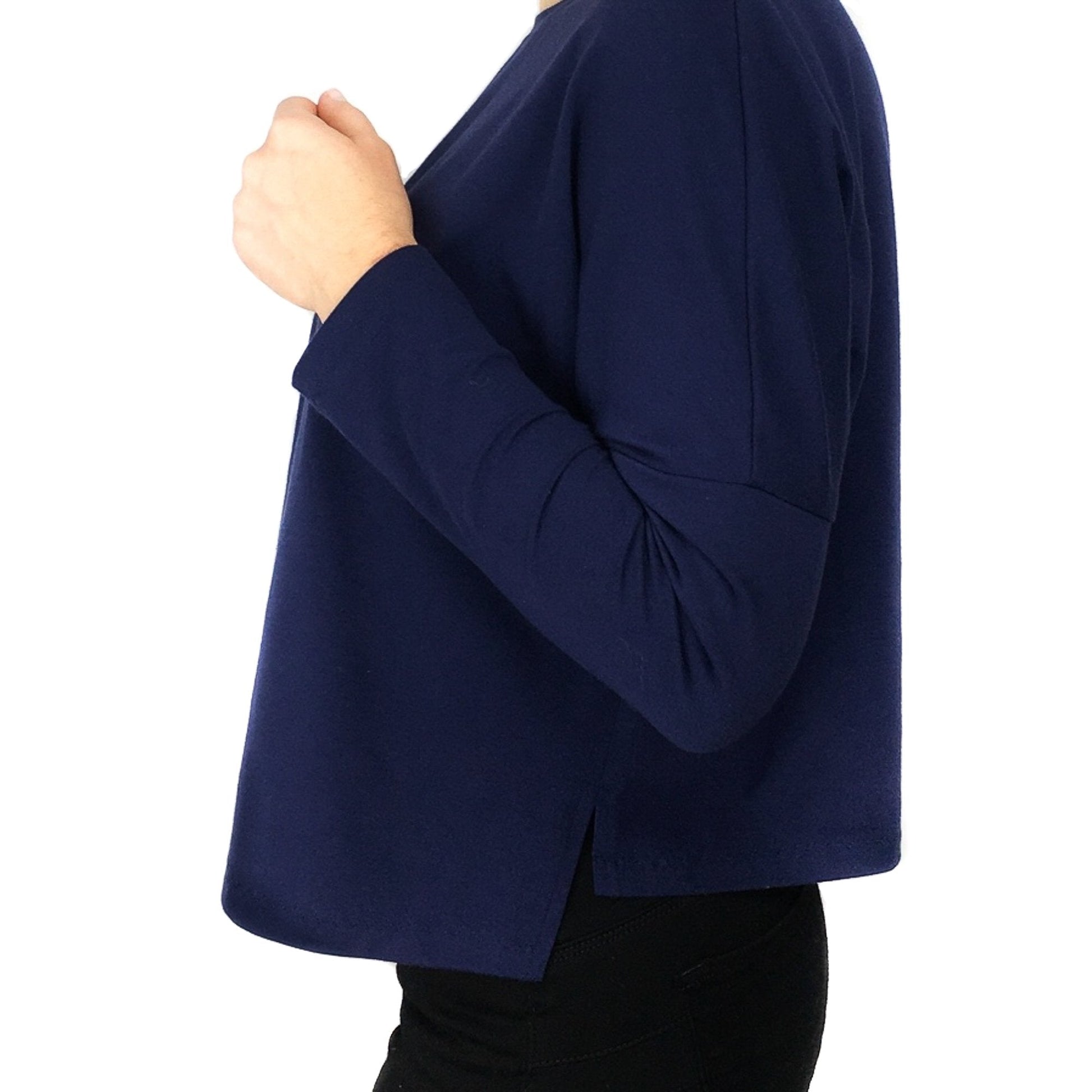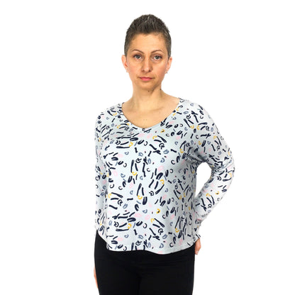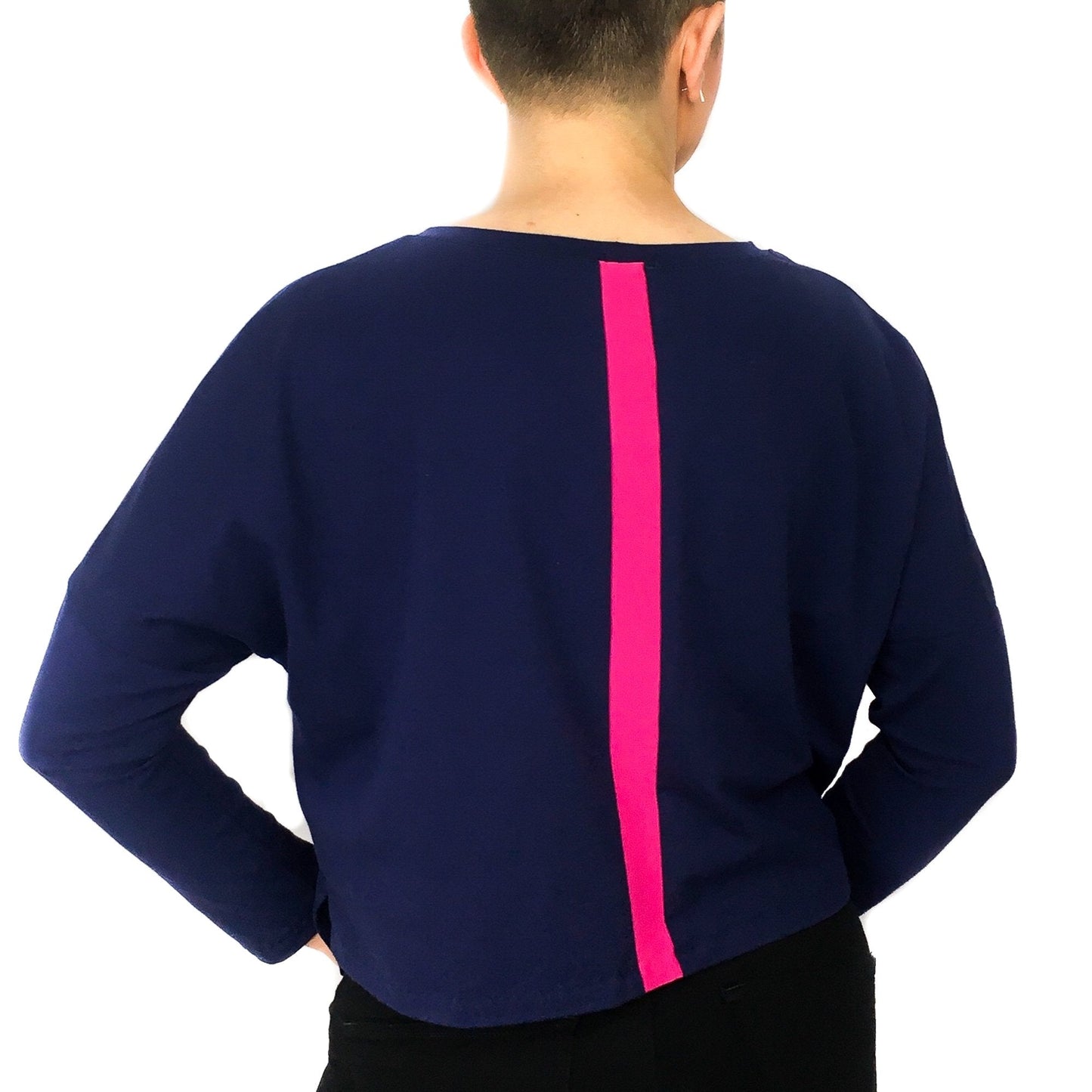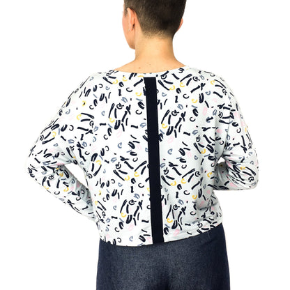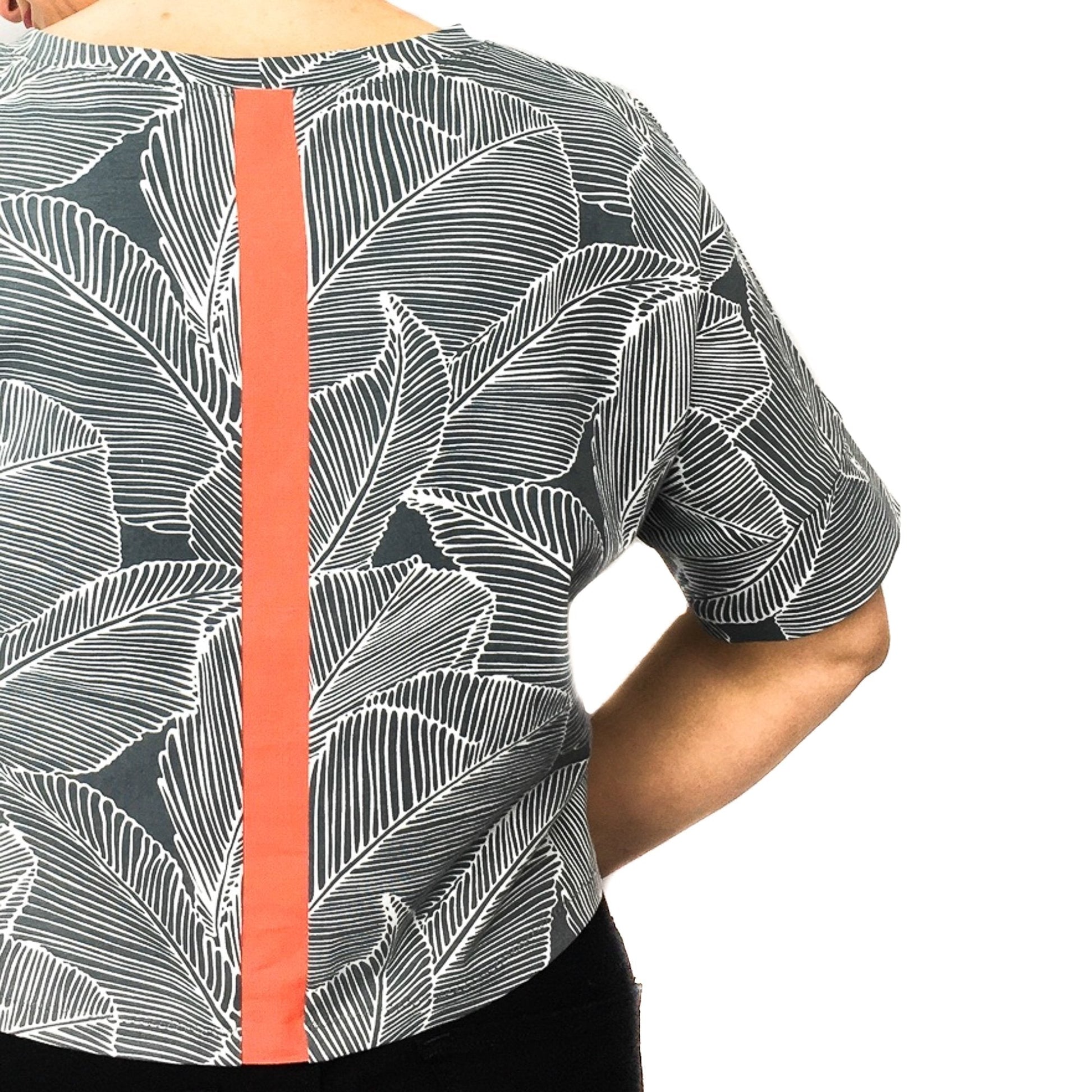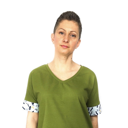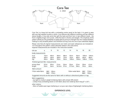 Cora Tee is a boxy knit top with a contrasting centre panel at the back. It is great to wear with any high waisted trousers or skirts. Cora features a round or V neckline and two different sleeve lengths. It has side vents that split the back and front hem in two different levels - the front is slightly longer and curved, while the back is shorter and straight. The simplicity of this pattern allows you the possibility to easily add any amount of length from the marked waistline, making it a very versatile pattern and therefore turning Cora into one of your wardrobe staples. The contrasting back panel gives you the opportunity to use any small and special piece of fabric that you might have saved from another project or even refashion an old and loved item of clothing.