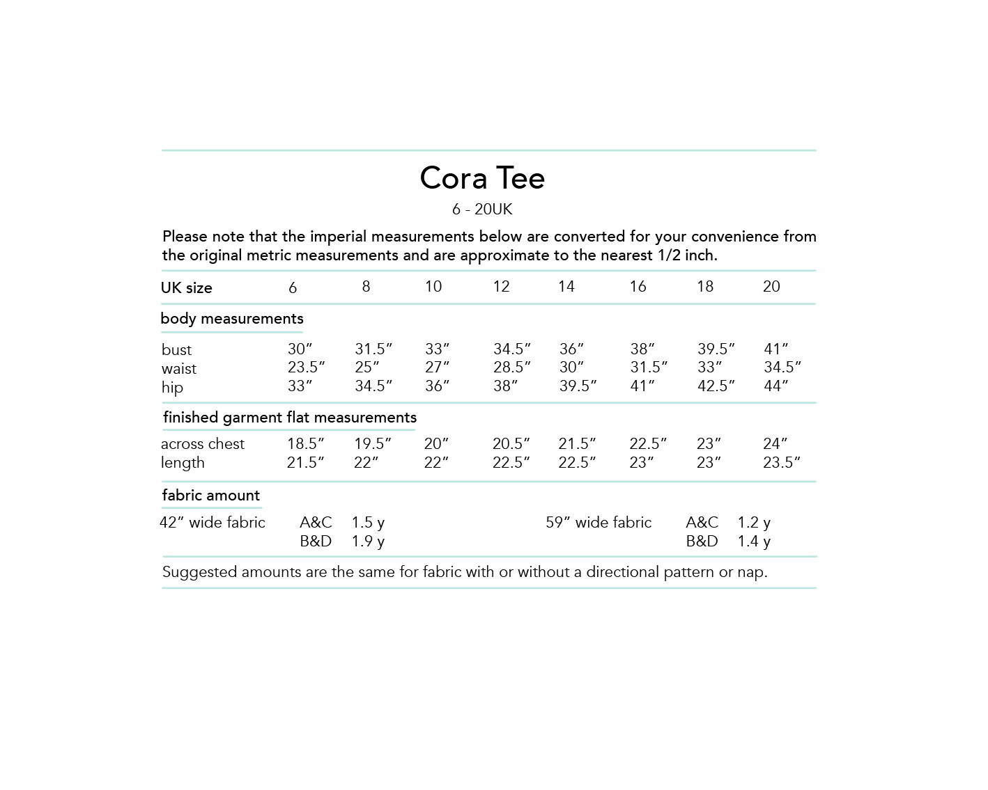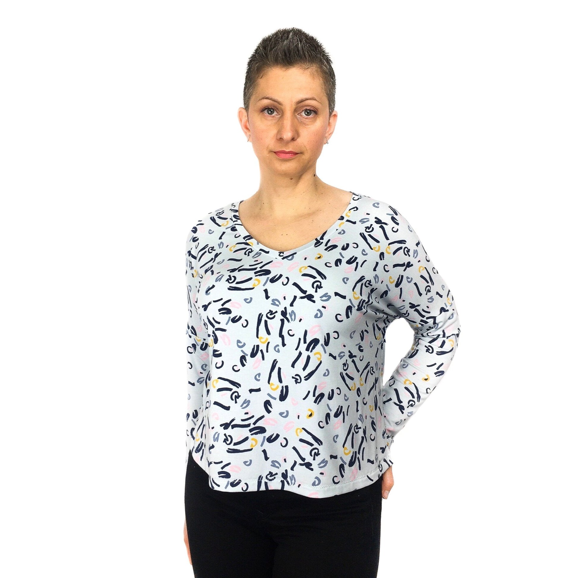 This pattern is suitable for any type of light/medium weight jersey fabric with at least 20% stretch.