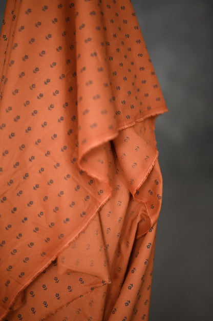 A delicate ditsy floral print – a dusty red plain with a navy print. This is a hand blocked print so please expect each flower to look unique!