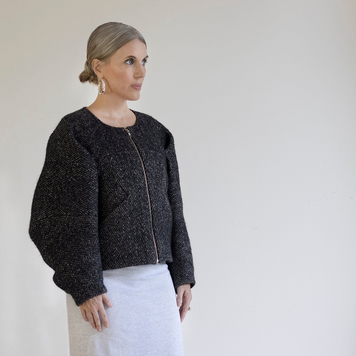 The Falda Jacket (Pattern #402) was developed using a combination of draping and flat paper pattern making. Fabric carved into bold clean shapes. A nod to the classic Chanel tweed, the sensibility of a bomber jacket and the humour and volume of a victorian era sleeve.