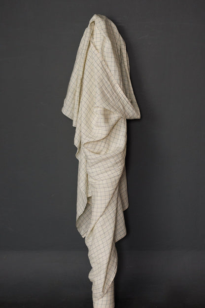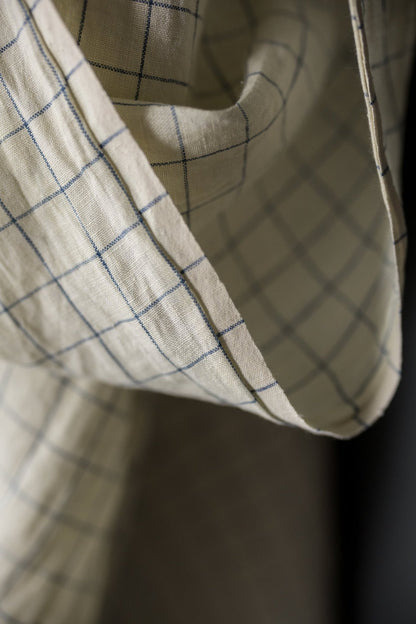 A fine blue check on a soft white background. A European laundered linen, tumbled at the mill for softness.
